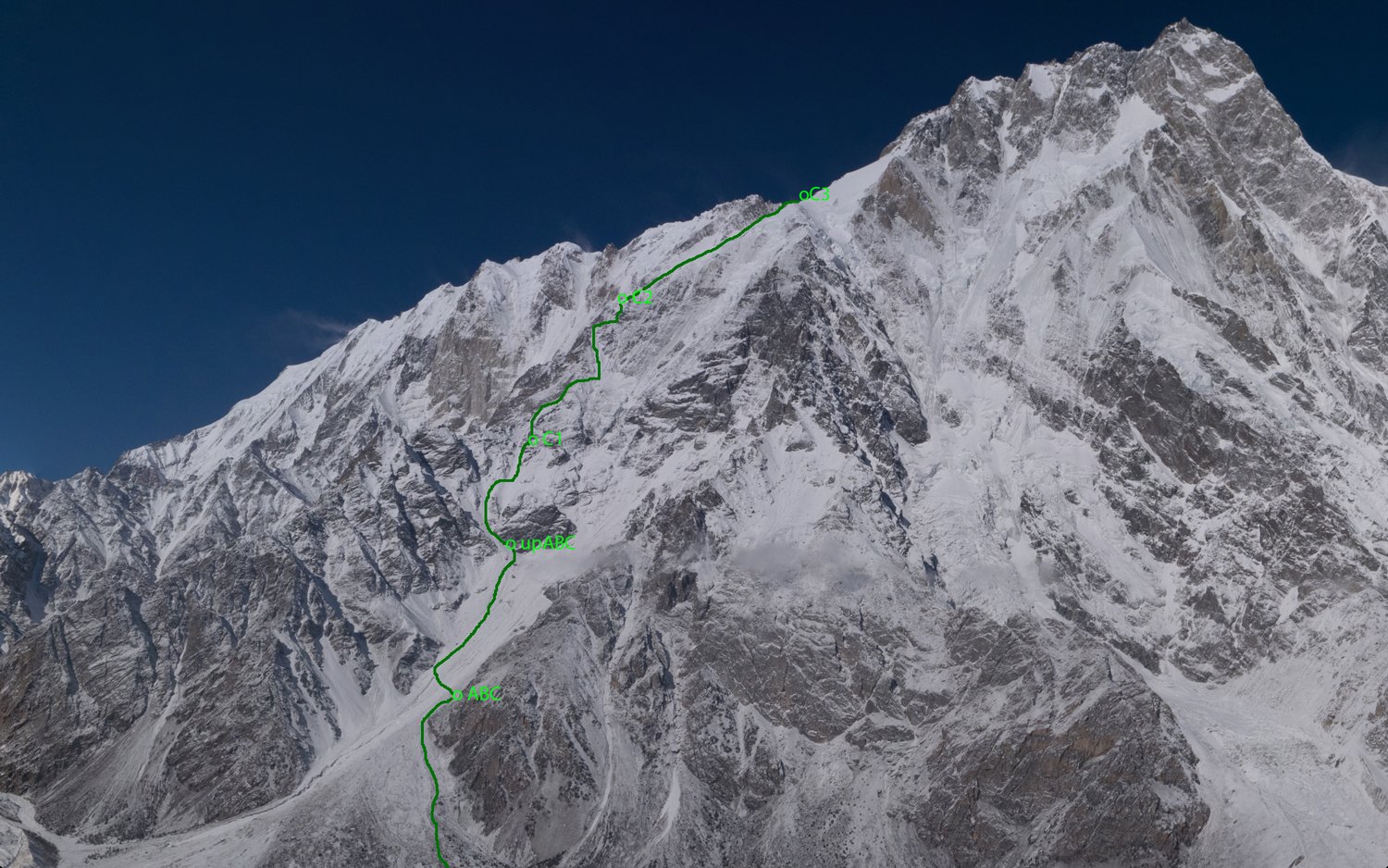 Beide Teams sind auf der sogenannten Schell Route, eine vom Österreicher Hans Schell 1976 eröffnete Linie, die im linken Teil der Rupal Flanke beginnt und über den Mazeno Grat, die Mazeno Scharte auf der Diamir Flanke, der anderen Seite des Berges wechselt, unterwegs. An der Diamir Flanke ist vor wenigen Tagen der Deutsche Bergsteiger Ralf Dujmovits gescheiteret, zu gefährlich waren die Seracs.