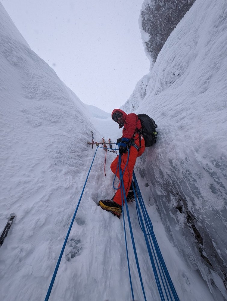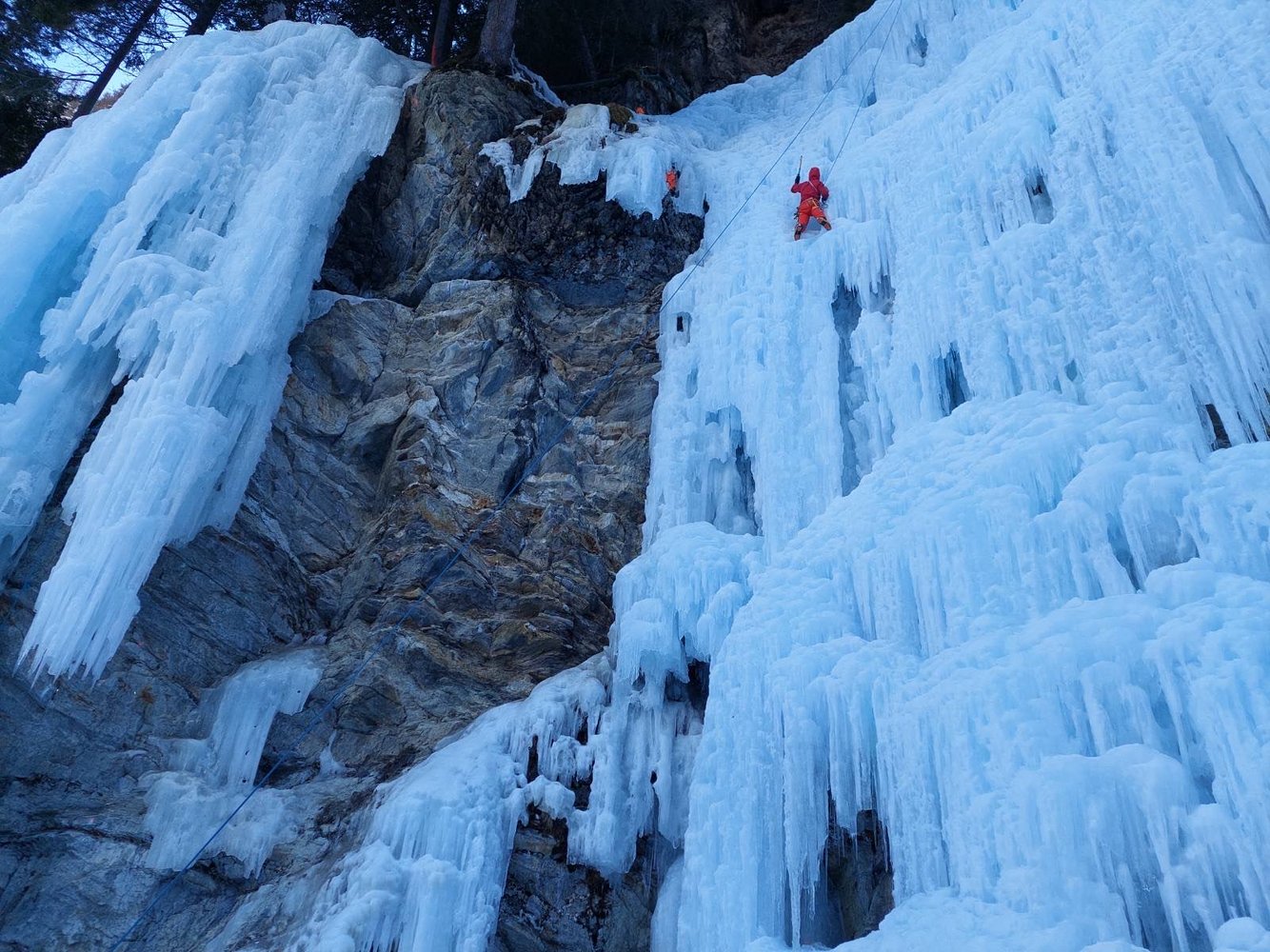 Flo übernahm die Führung. Mit dem scharfen Ende des Seils und frisch ausgepackten Eisschrauben stieg Flo Thamer souverän über den Vorbau und weiter in die rechte WI6-Variante ein, während unten vom Körper gesichert wurde. Sechs Schrauben hatte Flo bereits gesetzt, als es plötzlich zu einem kaum fassbaren Ereignis kam.