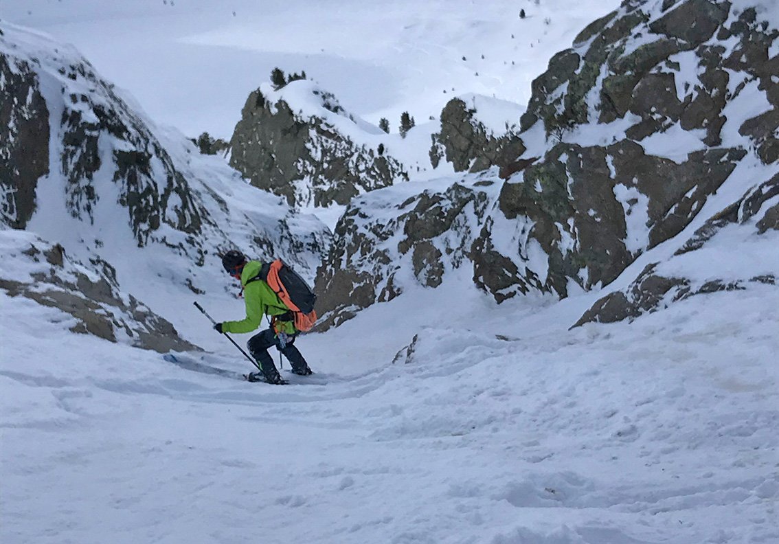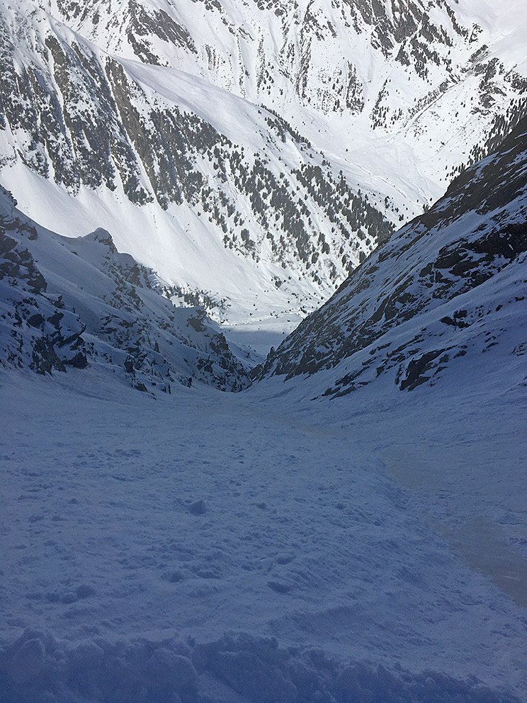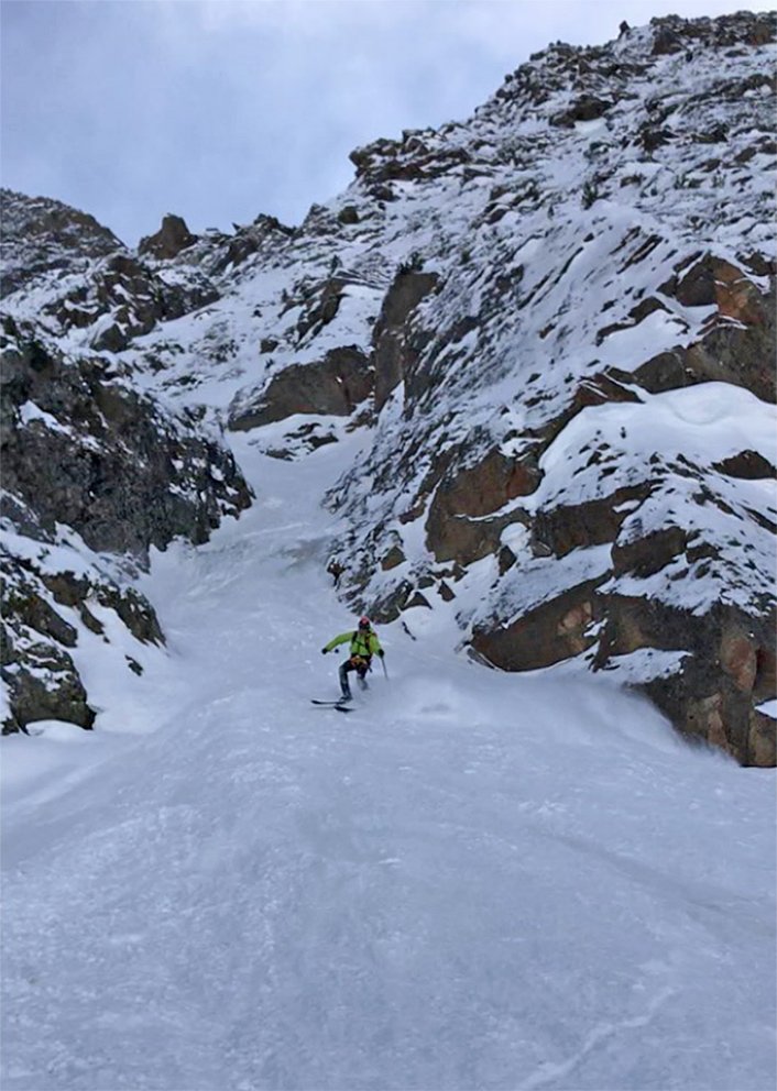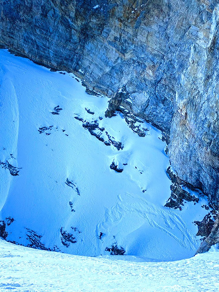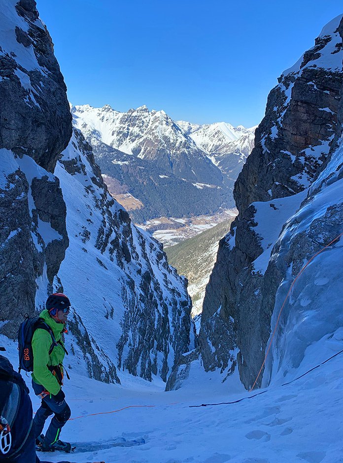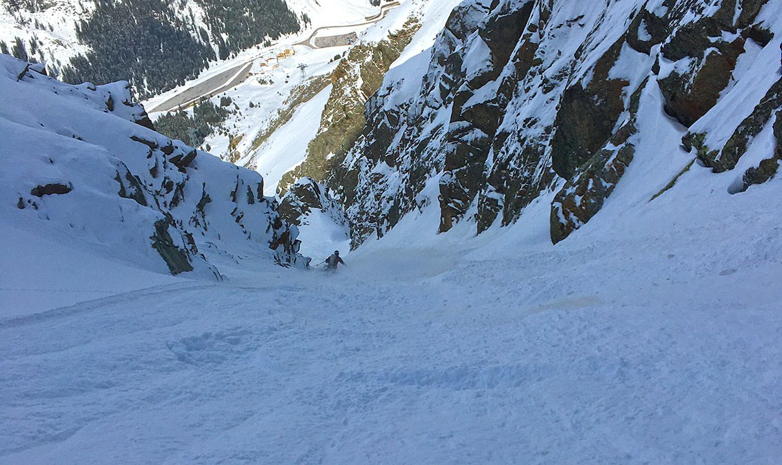 Als Zweites wurde dann die Kesselspitze Nordrinne, auch Kesselspitze Nordcouloir genannt, in Angriff genommen. Schon als ich im Sommer meinen Fuß gebrochen hatte und beim Stöbern nach neuen Touren zum ersten Mal diese Tour entdeckte, konnte ich es nicht erwarten, im Winter diese Rinne anzugehen. Am 28. Februar war es dann so weit und in einer Gruppe von 7 Personen machten wir uns auf den Weg Richtung Kesselspitze. Bei traumhaftem Wetter fuhren zuerst mein Bergfreund Thomas und ich in die Rinne ein und richteten den ersten Standplatz für die anderen ein. Glücklicherweise hatten wir Funkgeräte dabei, denn zu siebt so eine Rinne hinunterzufahren kann in Hinsicht auf Sluff Management ohne Funkgeräte dann doch zu einer größeren Herausforderung werden. Wir hatten pistenartige Bedingungen, welche uns in dieser Rinne - die immerhin drei Abseilstellen aufweist - doch sehr recht waren. Nach der zweiten Abseilstelle kam dann in der Hauptrinne der Klemmblock, der ein kleines Highlight für uns war. Die kleinen Höhlen, die zwischen Klemmblock und Rinne entstanden sind, durch welche man bei wenig Schnee angeblich durchfahren kann, zu erkunden, war sehr interessant und auch die Vorstellung, dass vor vielen tausend Jahren dieser Riesenblock hier herunterstürzte und sich dann abrupt verklemmt haben muss, war sehr spannend. Beim Auto schauten wir auf 1700 Abfahrtsmeter und eine sehr spannende und erlebnisreiche Steilrinnenabfahrt zurück.