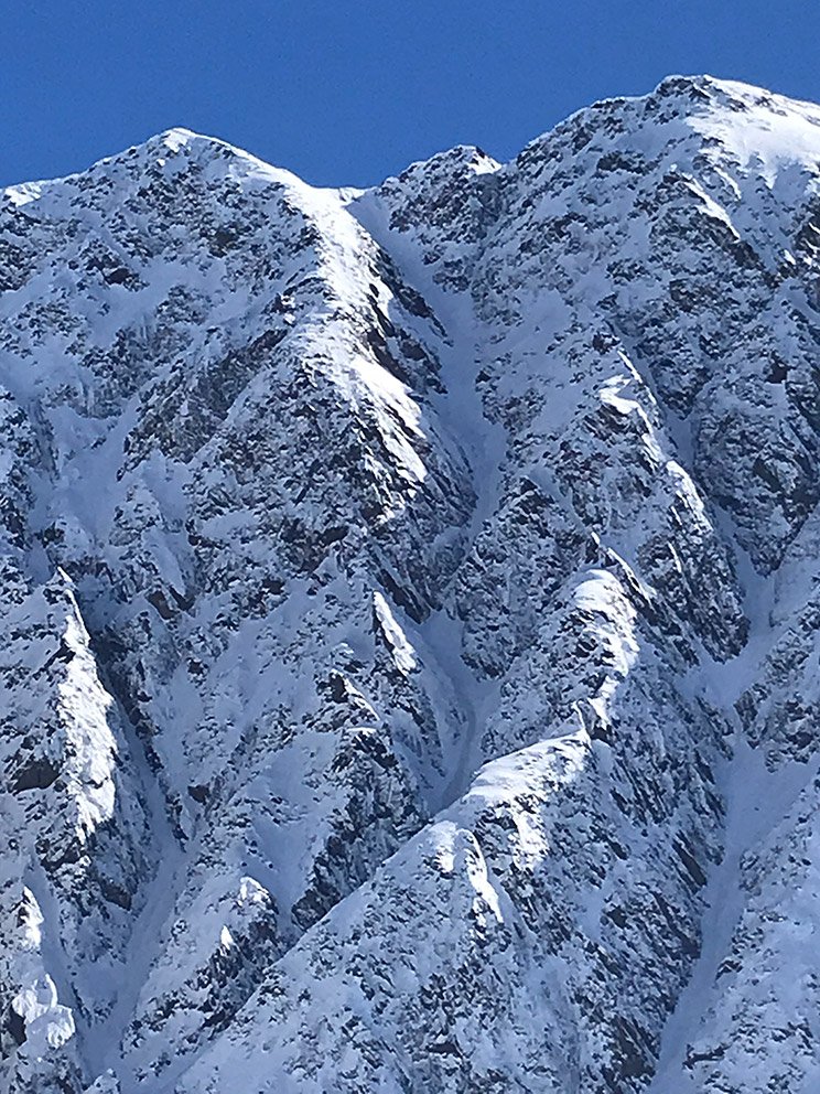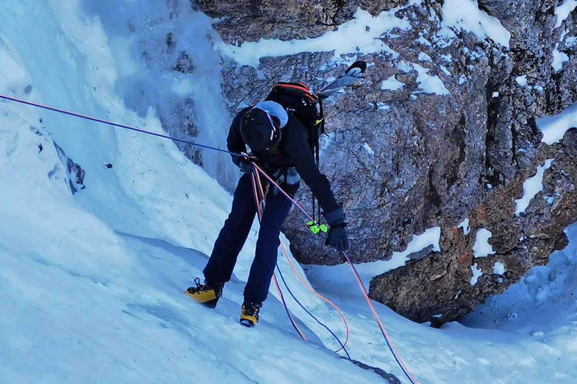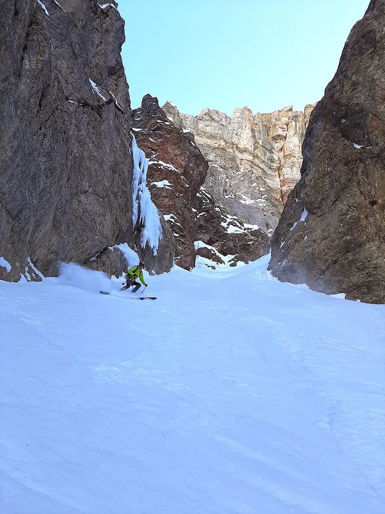 Also wagten wir es in die Rinne einzufahren, bewaffnet mit Schlaghaken und Keilen für die (vielleicht) auf uns zukommende Abseilstelle. In der Rinne fanden wir dann unerwartet gute Verhältnisse. An vielen Stellen war der Schnee schon weggeslufft, aber an vielen anderen konnte sich der Sluff festsetzen und wir konnten im hüfttiefen Sluff Schwünge ansetzen. Zwischendurch hatten wir dann allerdings trotzdem die obligatorischen Pistenverhältnisse. Nach dem ersten Drittel entdeckten wir dann, dass wir einmal abseilen müssten. Einerseits war das gut, weil somit die Frage nach der Erstbefahrung geklärt war. Wir sahen nämlich keine Anzeichen von einem alten Abseilstand. Allerdings mussten wir dafür selbst einen Abseilstand bauen. Das stellte zwar keine allzu große Herausforderung dar, ist aber doch immer wieder spannend. Nach dem Setzen der vertrauenerweckenden Schlaghaken seilten wir also ab. Wir hatten leider nur ein 40 Meter Seil dabei, was sich als leichter Nachteil erwies, weil wir eine Stelle etwas unangenehm abklettern mussten. Wir hatten aber Gott sei Dank einen Pickel dabei und konnten nach dieser etwas unangenehmen Stelle dafür die restliche Rinne in all ihrer Herrlichkeit genießen. Beim Auto angekommen konnten wir unser Glück über die guten Abfahrtsverhältnisse und diese gut gelungene Tour kaum fassen.