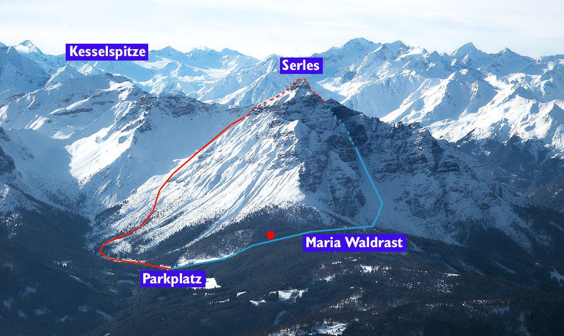 Die Stubaier Alpen - bestehend aus Kalkkögel, Serles, Lämpermahdspitze und Kesselspitze - zeichnen sich durch ein Kalkgestein aus, das über viele Jahre durch Erosion beeindruckende Rinne gebildet hat, die mit berühmten Rinnen in den Dolomiten, wie dem Canale Holzer, um nur ein Beispiel zu nennen, ohne weiteres mithalten können. Aber auch im Urgestein kann man sehr schöne Rinnen finden, wie diese Erstbefahrung beweist. So fällt einem schon von der Europabrücke aus gesehen die beeindruckend breite und steile Serles Nordrinne auf. Aber auch die Kesselspitze Nordrinne sticht dem Freerider von bestimmten Plätzen im Stubaital sofort ins Auge, wobei diese schon sehr viel schmäler und exponierter wirkt als die Nordrinne der Serles. Um den 20. Februar machte sich ein Hoch bemerkbar, das mit recht hohen Temperaturen nicht nur bestes Skitourenwetter und schöne Firnverhältnisse bot, sondern zum ersten Mal in diesem Winter die meisten Schwachschichten Nordseitig zerstörte, was eine günstige Lawinensituation zur Folge hatte. Der perfekte Zeitpunkt also, um ein paar steile Rinnen zu fahren.