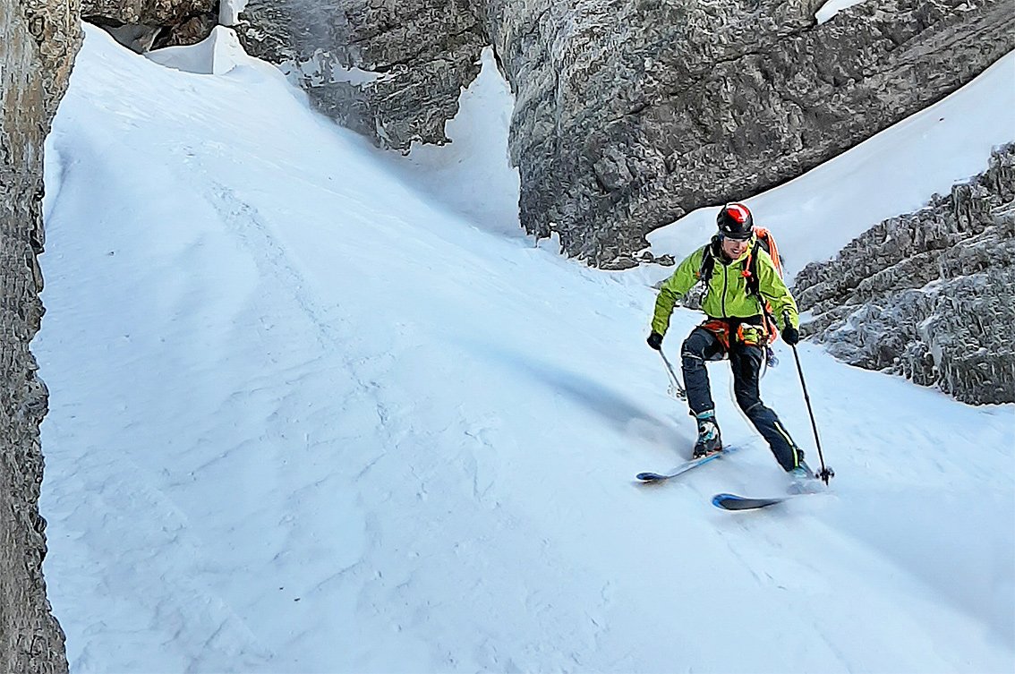 Die Serles Nordrinne machte den Anfang, als eine Rinne, die ich schon kannte. Ein Klassiker, den man als Innsbrucker immer gern noch einmal fährt. Das Besondere an dieser Rinne ist ihre Breite. Man kann beim Befahren ab und an also durchaus von Genusswedeln sprechen, sofern der Schnee passt. Bei uns war es eher ein pistenähnliches Erlebnis.