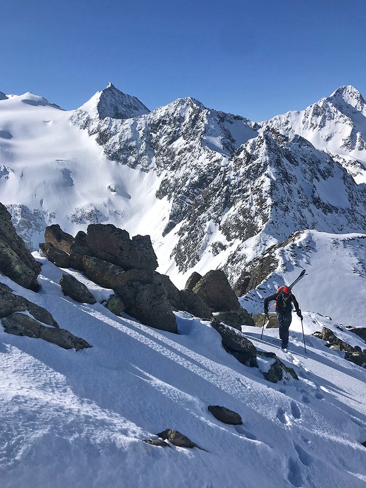 Als Krönung kam dann die Trögler Nordrinne in frage, die mein Freund Yannik entdeckt hatte und die wir zusammen, als wir einmal auf die Ruderhofspitze gegangen waren, mit einem Fernglas genau begutachtet hatten. Fraglich waren für uns zwei Dinge: Einerseits konnten wir nicht genau erkennen, ob man einmal abseilen muss und zum anderen fragten wir uns, ob denn nicht schon jemand vor uns diese Rinne abgefahren ist. Zweimal mussten wir die Befahrung dann verschieben und bekamen langsam auch ein bisschen Stress, weil sich eine kommende Niederschlagsperiode abzeichnete, nach der wir sicher wieder warten hätten müssen, bis die Verhältnisse gut gewesen wären. Nach etwas Niederschlag in der ersten Märzwoche beschlossen wir nach ausgiebigem Studieren des Lawinenlageberichts und der Wetterstationen, dass es am 7. März einen Versuch wert wäre, zum Einstieg der Rinne zu gehen und je nach Bedingungen die Abfahrt zu wagen. Ein mögliches Problem war der nordseitig prognostizierte Triebschnee, der uns Sorgen machte. Da die Wetterstationen allerdings alle Südwestwind anzeigten und uns beiden der Schnee am Samstag sehr ungebunden vorkam, versuchten wir es also am Sonntag. Eines muss ich an dieser Stelle anmerken: Der Aufstieg auf den Großen Trögler ist durchaus lohnend - man findet zu Unrecht keine Informationen über Skitouren auf diesen Berg. Ich dachte mir sogar, dass - wenn die Rinne zu gefährlich wäre - wir trotzdem eine schöne Abfahrt im Bereich der Aufstiegsspur hätten. Vom Gipfel gingen wir dann schnell zum Einstieg und sahen dort keine Anzeichen für Triebschnee.