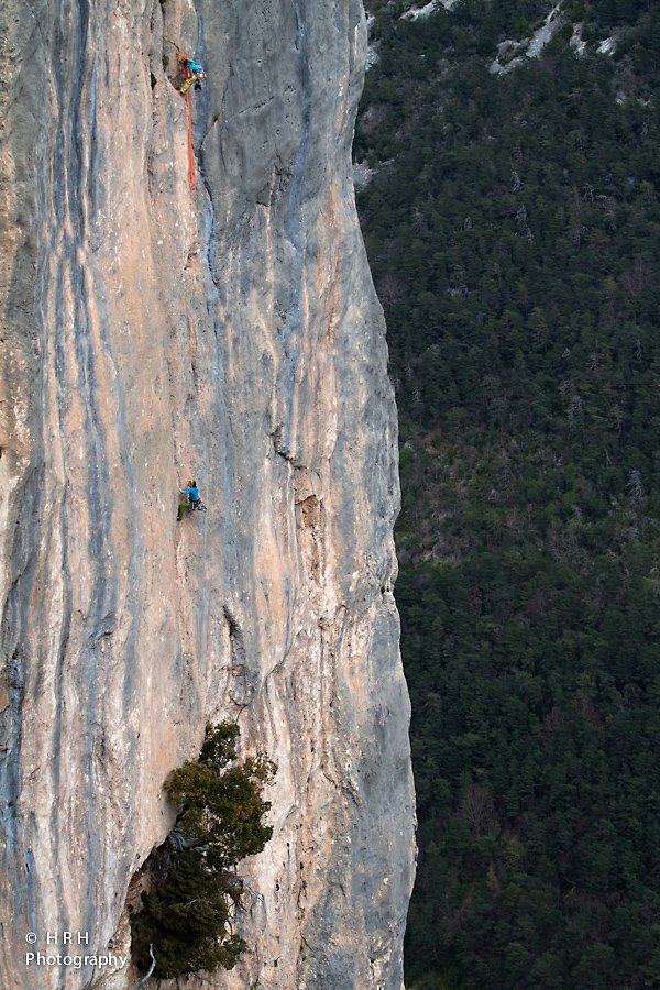 Der Zustieg beträgt eine Stunde und 20 Minuten, die Route selbst erreicht man durch Abseilen. „Tom et Je Ris“ ist extrem ausgesetzt, startet mitten in der Wand, hoch über der Verdon und die Kletterei ist sehr anhaltend. Mit einem Wort: ein Psychotrip!