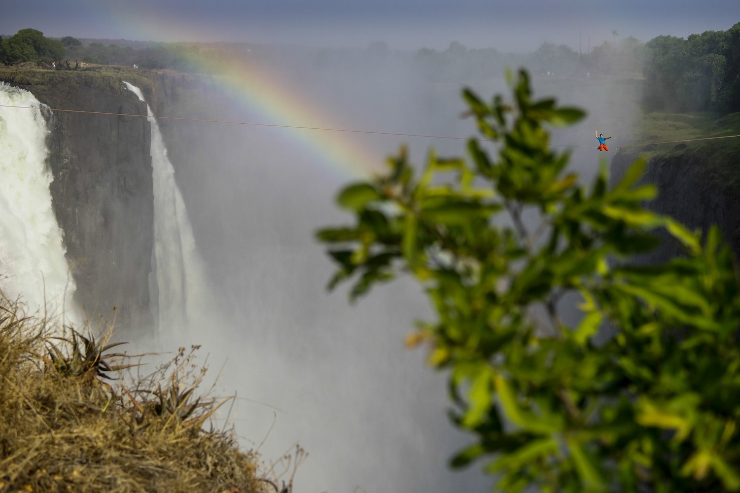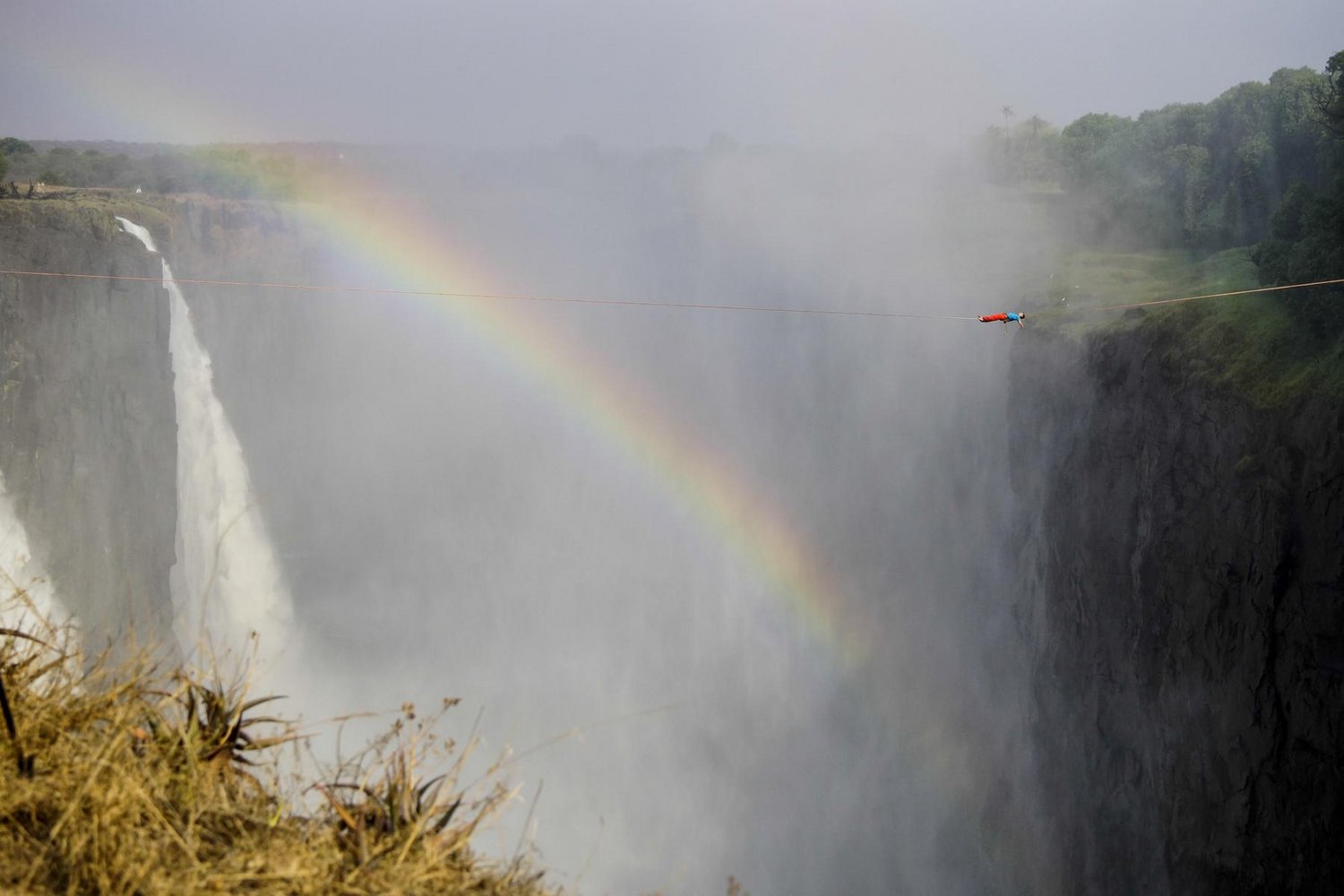 Eine Highline gilt offiziell als begangen, sobald sie ohne Sturz überquert wurde. Dies gelang sowohl Lukas Irmler als auch Reinhard Kleindl gleich am ersten Tag nach wenigen Versuchen. „Man unterschätzt schon wie viel Druck man sich selber macht, die Begehung auch zu schaffen, vor allem bei so einer langen Line und so schwierig einzuschätzenden Bedingungen, die sich tagsüber ständig verändern. So war es für uns nicht ganz leicht, selbstbewusst an die Sache ranzugehen, obwohl wir drei Tage Zeit hatten“, sagt Irmler. „Umso überraschender und schöner war es für uns, die Line gleich am ersten Tag befreien zu können. Somit konnten wir uns die Zeit nehmen, zu spielen und uns einfach mal in 100 Metern Höhe hängen zu lassen.“ Die beiden Slackliner hatten dabei nicht nur einen einmaligen Blick auf die Wasserfälle, sie sahen in der Dunstwolke unter der Line auch einen kreisrunden Regenbogen im Sprühnebel. „Wir haben über zwei Jahre darauf gewartet, hierher zu kommen. Das ist eine lange Zeit, in der sich herauskristallisiert hat, wie gut das Projekt wirklich ist. Wenn’s nicht das Beste überhaupt wäre, hätte man nicht zwei Jahre lang darauf gewartet, diesen Moment zu erleben und diese Chance zu bekommen. Wir werden diese Highline, die wir „Nyami Nyami“ nach dem Zambezi River God genannt haben, und die Erlebnisse hier in Zimbabwe sicher nie vergessen.“