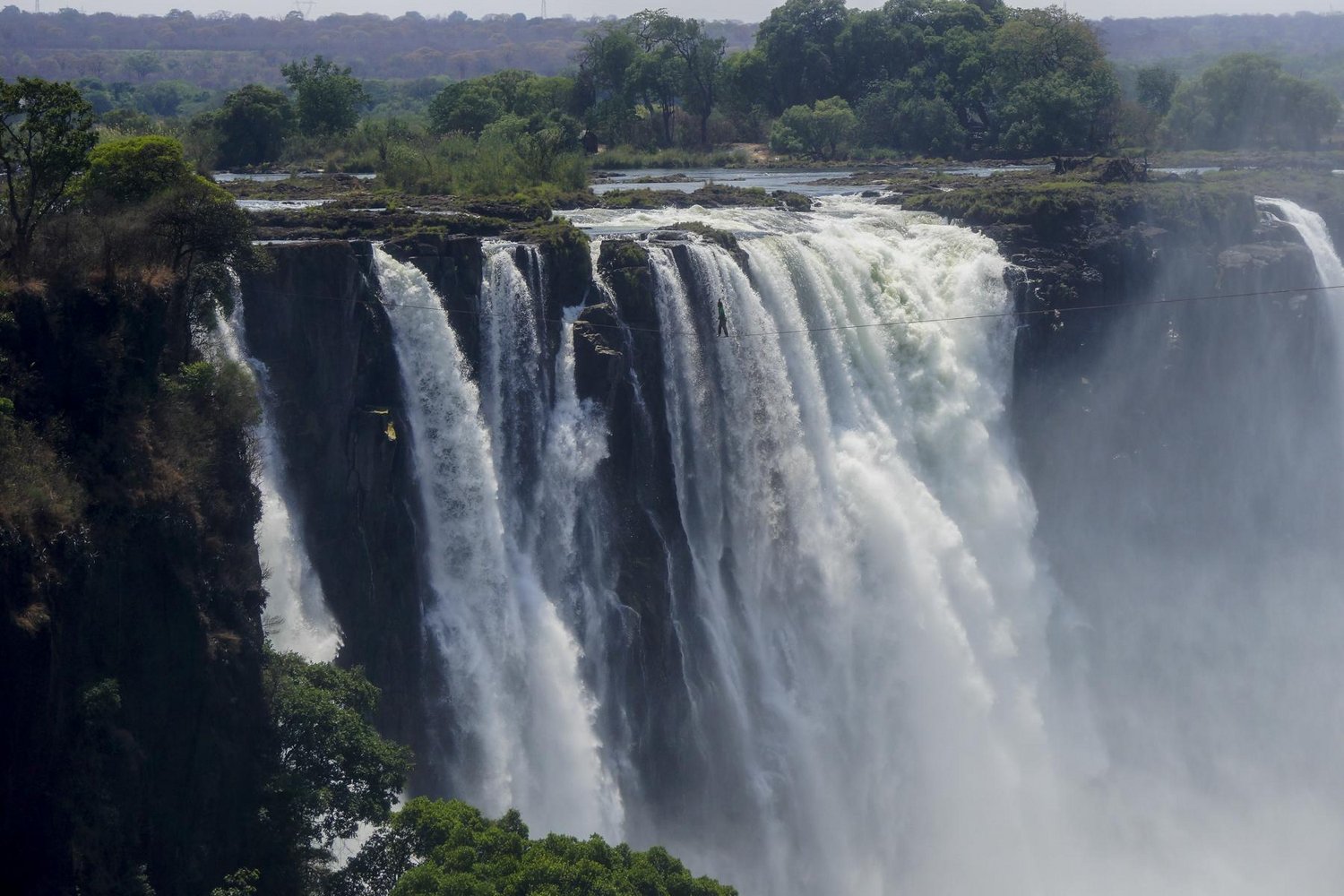 Als weitaus größere Herausforderung entpuppte sich jedoch die Planung. Es dauerte mehrere Monate die Behörden vor Ort von dem Projekt zu überzeugen und alle notwendigen Genehmigungen zu erhalten. Das Timing musste sich vor allem am Wasserstand des Sambesi orientieren. „Wenn der Wasserstand zu hoch ist, steigt die Gischt bis zu 300 Meter auf und man kann gar nichts machen“, erklärt Kleindl. „Da die Wasserstände jedes Jahr variieren, war es schwierig, den richtigen Zeitpunkt zu bestimmen, an dem es überhaupt möglich ist, hier eine Highline zu spannen. Auch die Inseln auf der Wasserfallseite sind nur wenige Wochen im Jahr per Boot erreichbar, so wussten wir bis zum Schluss nicht, wie wir unsere Line auf der anderen Seite befestigen können. Zum Glück haben wir dort einen stabilen Baum bei einer Distanz von 91 Metern gefunden, der uns ermöglichte, eine cleane Highline aufzubauen. Wir hätten zwar die Genehmigung gehabt, temporäre Bohrhaken zu setzen, aber in unserem Sport, wie in anderen Bergsportarten, möchte man gerne möglichst wenig Spuren hinterlassen, vor allem wenn man – wie bei diesem Projekt - das Vertrauen der Zimbabwe Parks und Wildlife Management Authority genießt.“