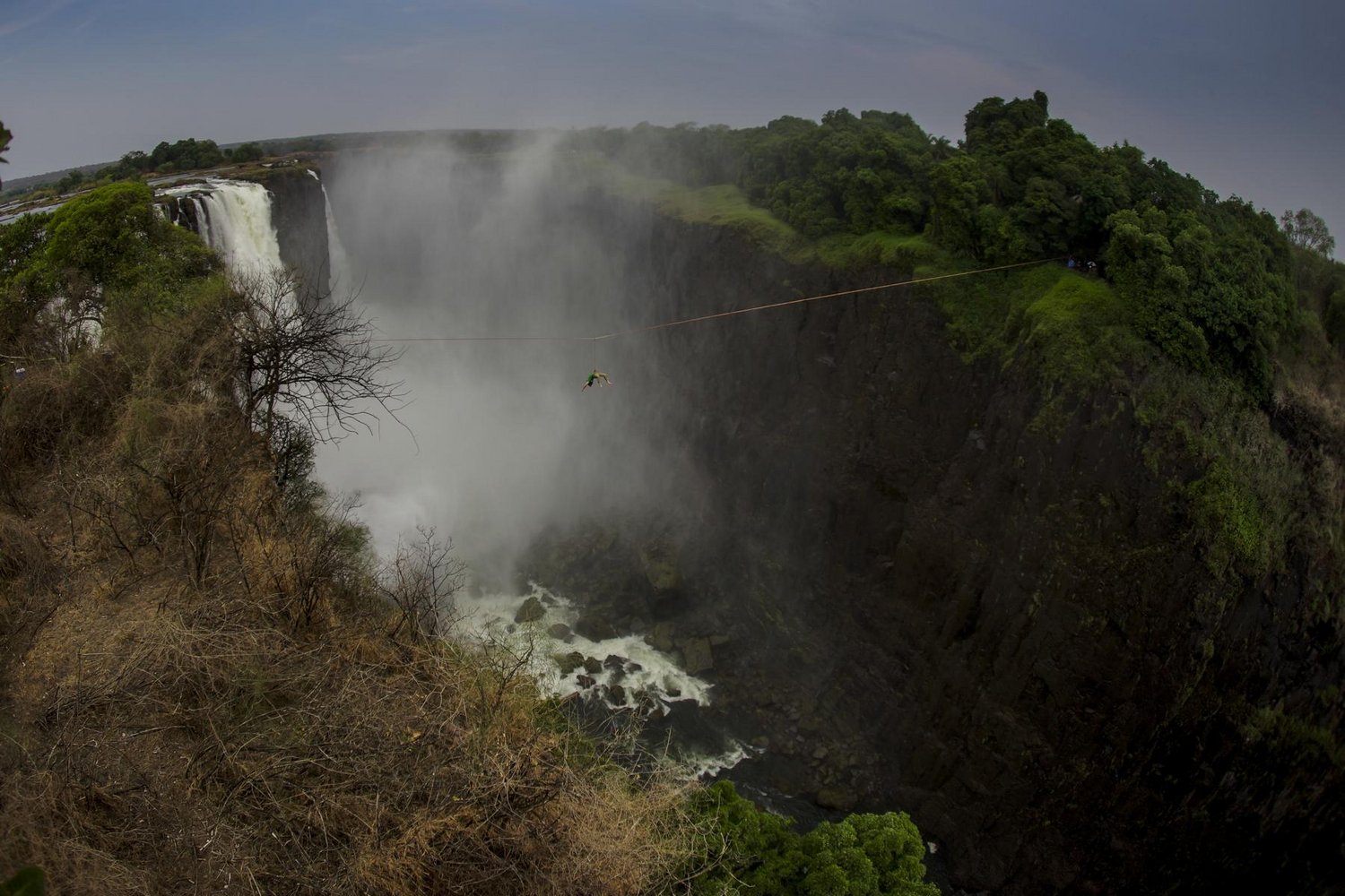 Ein Hindernis galt es dennoch zu überwinden: die Überbrückung der 100 Meter tiefen und 1,7 Kilometer breiten Schlucht. Kleindl und Irmler planten zunächst eine Angelschnur mit einer Drone über die Schlucht zu transportieren um die Verbindung herzustellen, doch als sie hörten, wie viele Dronen bereits bei Dreharbeiten an den Victoria Falls versenkt worden waren, schwenkten sie um auf Plan B: ein an einer Angelschnur befestigtes Bleigewicht mit einer Baumpflegeschleuer über die Schlucht zu schießen. Dies klappte im dritten Versuch.