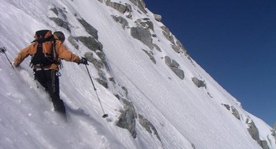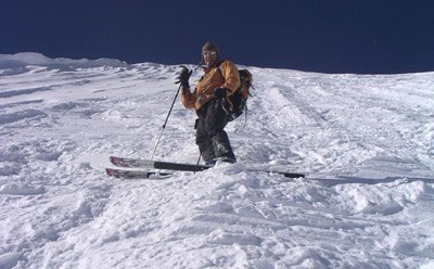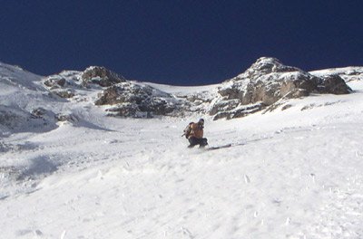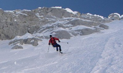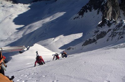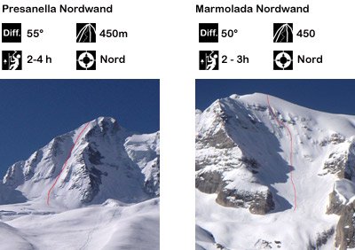 Nach zeitigem Start am Fedaiasee und Zustieg über die Piste zum Gletscher unter der Nordwand, erreichten Christian Treimer und Stephan Wagner um acht Uhr die Marmolada di Penia über die felsdurchsetzte Nordwand. Sie begannen sogleich mit den Vorbereitungen für die Abfahrt, um nachkommende Kletterer durch bei der Abfahrt abgehehnden Schneerutsche nicht zu gefährden.