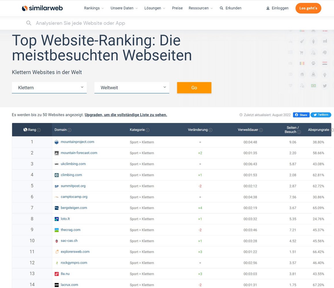 Um so mehr freut es uns, dass wir mit gut recherchierten und gut aufbereiteten Tourenbeschreibungen (Anm.: in einem einzigen Topo stecken zwischen 3 und 5 Std. Zeichenarbeit) unsere Besuchszahlen 2022 weiter auf ein neues Rekordniveau (1 Mio. im Aug. 2022) steigern konnten. Im internationalen Vergleich sind wir Nr. 7 der meistbesuchten Kletter-Websites weltweit, vor 8a.nu, thecrag, planetmountain oder hikr. Mehr dazu findet ihr auf bergsteigen.com Traffic Analytics & Marktanteil | Similarweb.