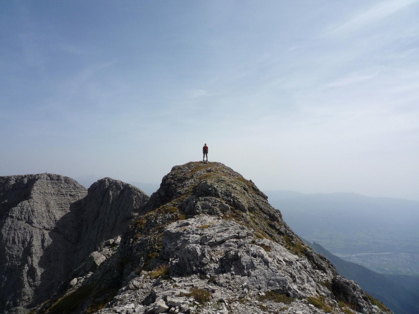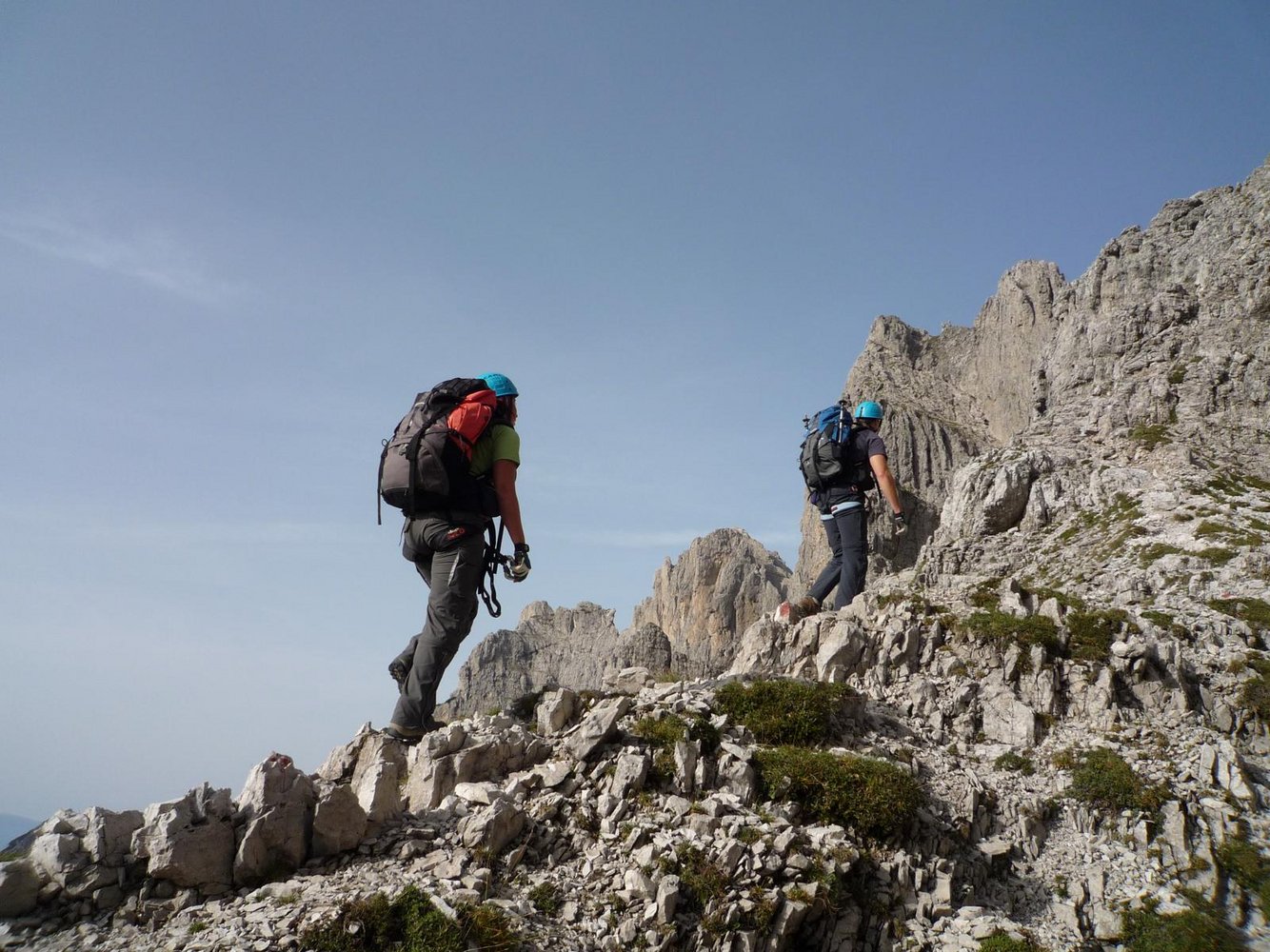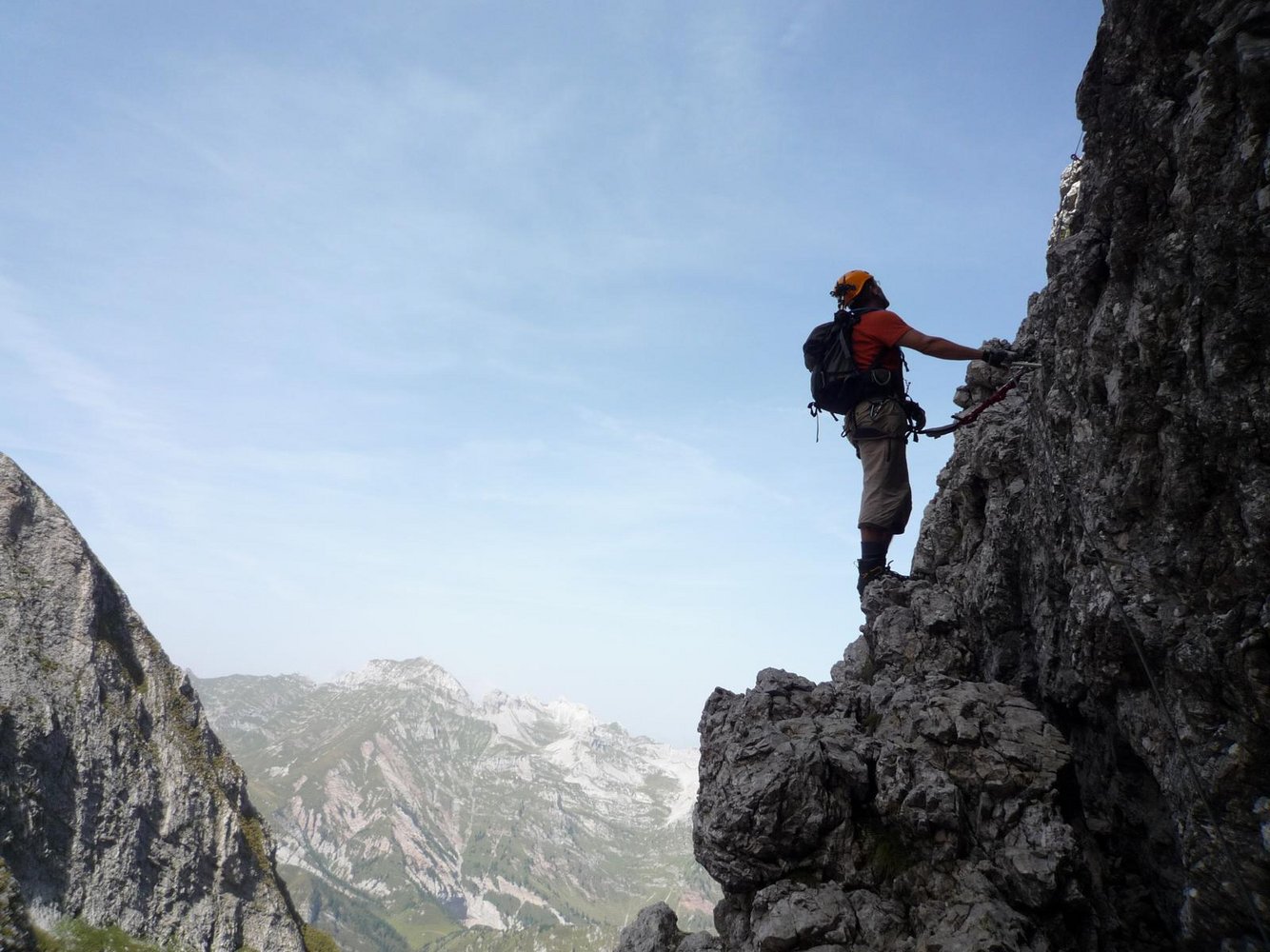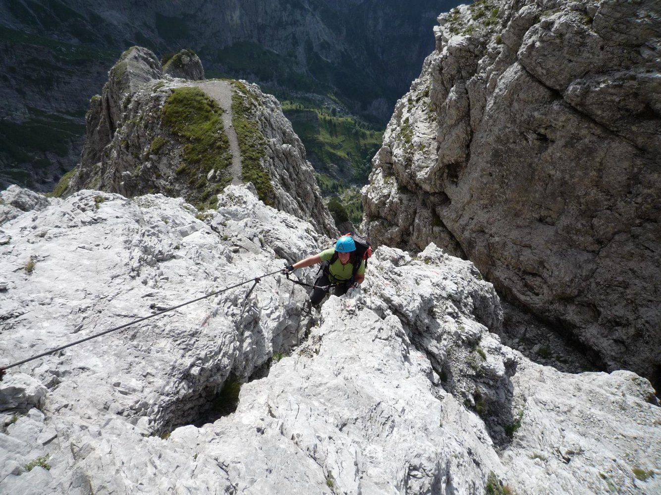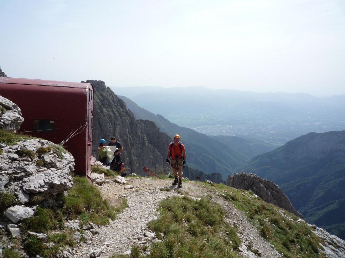 Am nächsten Tag sind wir schon in aller Früh Richtung Ferrata Zacchi unterwegs. Der Weg dorthin und die ersten Klettermeter sind uns bereits von gestern bekannt, da diese mit der Ferrata Marmol identisch sind. Auf einem kleinen Latschenabsatz nach der Einstiegswand trennen sich aber die beiden Steige und die Zacchi zeigt gleich mit der ersten Schlüsselstelle, einer senkrechten, nur mit einem Seil gesicherten Rinne, dass man in diesem Abschnitt etwas mehr auf Zack sein muss. Ein schöner, lang gezogener, vorgelagerter Gratrücken lädt danach noch einmal zum Verschnaufen ein, bevor sich die Wand senkrecht aufstellt. Der steile Schlusspfeiler, die zweite sehr luftige Schlüsselstelle ist gespickt mit Leitern und führt in einen kleinen Geröllkessel. Auf einem schmalen Band, welches uns wieder an die Bänder im Zentrum der Dolomiten erinnert, geht es zum Bivacco Bernardina. Das Wetter ist traumhaft, was laut Hüttenwirt aber keine Selbstverständlichkeit ist; denn nur allzu oft staut sich die feuchte Meeresluft an den ersten großen Erhebungen der Alpen, womit auch das vermeintliche Überangebot an Biwakschachteln gerechtfertigt erscheint.