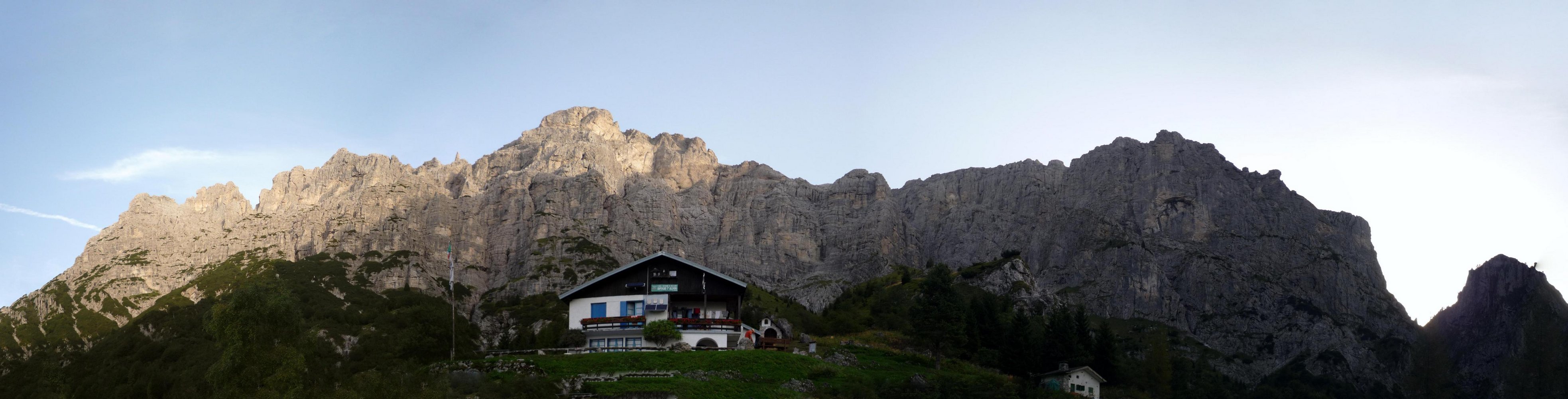 Bei der Anfahrt kommen aber erstmals Zweifel an der Qualität des Gebiets auf, zu weit ist man bereits in der heißen, flachen Ebene mit dem nicht gerade hübschen Städtchen Belluno und zu fern sind die hohen Dolomitenberge. Auf dem kleinen Wanderparkplatz beim Weiler Case Bortot hat sich das Gefühl eher verschlimmert – dort, so abgeschieden und nahe bei Belluno, soll ich mein Auto zwei Tage zurücklassen, – und wo sind die Felswände? Widerwillig machen wir uns bereit für den Hüttenzustieg, der sich entlang des Baches – anfangs auf teilweise ausgesetztem Pfad, dann direkt am Bach – durch dichten Laubwald zum Rifugio 7° Alpini schlängelt. Erst nach zweieinhalb Stunden ändert sich das Bild schlagartig, denn unmittelbar vor der Hütte lichtet sich plötzlich der buschähnliche Wald und man steht mitten im mächtigen Bergkessel unter dem Monte Schiara. Alle Zweifel sind nun wie weggeblasen und Ehrfurcht macht sich breit, vor dem, was in den nächsten Tagen auf dem Programm steht.