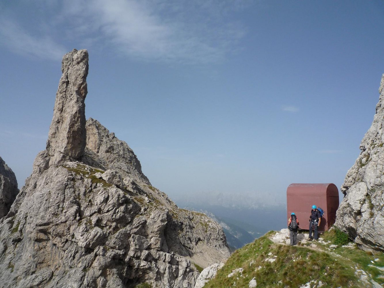 Die fünf Klettersteige auf engstem Raum, mit drei Biwakschachteln an den neuralgischen Punkten, lassen sich – mit etwas geschickter Planung – an einem Wochenende gut miteinander verbinden, wobei man sich vor dem Schlafengehen schon etwas auf den nächsten Tag einstimmen kann. Dem Vino Rosso sollte man – vor allem, wenn man im Stockbett oben schläft – nicht allzu sehr frönen, denn der Aufstieg in die hohen, dreistöckigen Eisenbetten hat die Klettersteigschwierigkeit C (K 3) und ist tückisch. Zu später Stunde ist dies nicht zu unterschätzen, ganz zu schweigen von den nächtlichen Notabstiegen (zum Klo). Davor wird noch die Routenfolge der nächsten zwei Tage festgelegt: Sperti – Berti – Marmol oder Zacchi – Marmol? Und was ist mit dem Sentiero attrezzato Marino Guardiano auf den Monte Pelf? Wir entscheiden, morgen mit der Runde Sperti – Berti – Marmol zu starten, am zweiten Tag über Zacchi – Berti – Sentiero Marino Guardiano auf den Monte Pelf zu steigen und von dort direkt über das Bivacco Medassa ins Tal abzusteigen. Zwar ist der kurze Verbindungssteig Berti an beiden Tagen auf dem Programm, was wir beim Frühstück anfangs noch dem Vino Rosso zuschreiben, was sich später aber als einzig sinnvolle Kombination entpuppt.