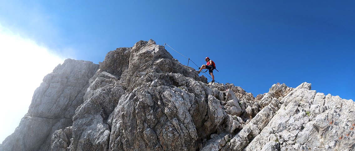 Wer in der Gegend Garmisch/Ehrwald ist und Zeit hat, sollte sich auch die Klettersteige im Alpspitzgebiet, dort gibt es für Kraftlackl den sogenannten Mauerläufersteig (D/E) und für Genießer die wunderschöne Alpspitz-Ferrata (B), anschauen. Aber auch in der Region Ehrwald gibt es mit den Klettersteigen unterhalb und oberhalb des malerischen Seebensees ein perfektes Klettersteigziel, zwar in Österreich, aber in unmittelbarer Grenznähe, mit Blick auf den Seebensee, in dem das Zugspitzmassv spiegelt. Sowohl am Seebensee-Klettersteig als auch am Klettersteig Tajakante heißt es aber fest zupacken, beide Klettersteige sind mit D/E bewertet.