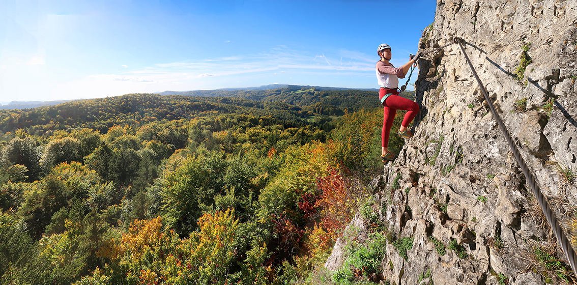 Vergleichbares, aber nicht ganz so spektakulär findet man am Oberlandsteig in Kohnstein. Oberhalb des markanten Dohlenfelsens bei Konstein zieht sich dieser einfache Klettersteig den Berghang entlang. Es gibt eine blaue, schwere (mit B/C bewertete) Variante und einen roten, leichten (A) Ferrata-Parcour. Wobei der rote Weg in der Regel als Rückweg genutzt wird, so kommt man auf eine schöne Runde unweit des Donautals. Ein schöner Mix aus Waldlandschaft und Kletterfelsen, mit etwas Glück kann man auch Kletterer am Dohlenfelsen beobachten oder einfach in das breite Tal schauen, in dem vor vielen hunderten Jahren einmal die Donau floss.