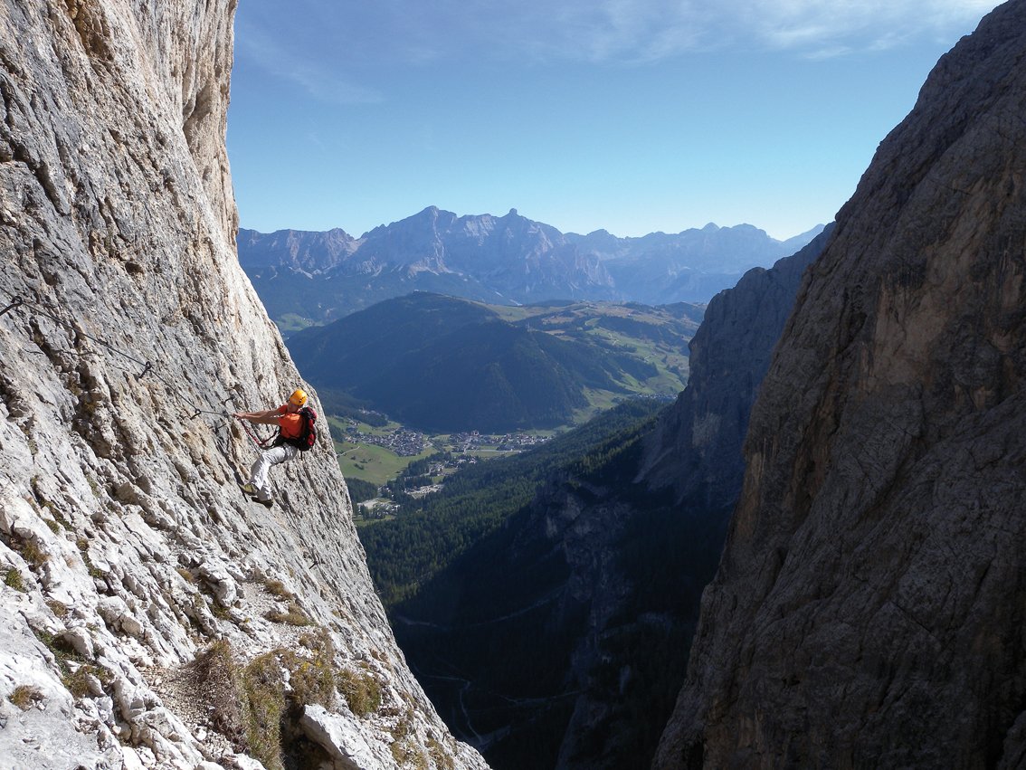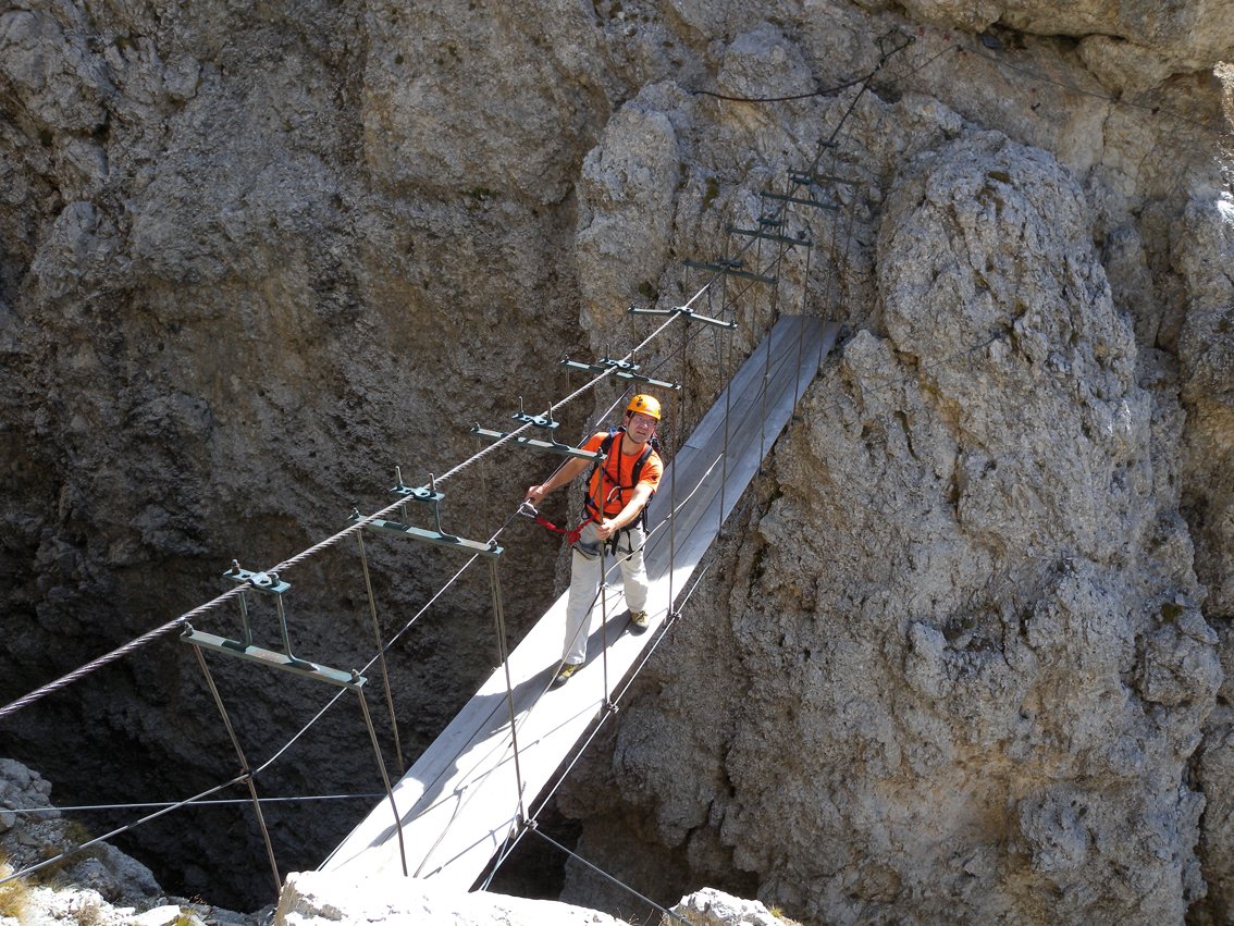 Die Sella flankiert von Pässen ist sicher der bekannteste Dolomitenstock. An der Nordseite befindet sich auch die meistbegangene Via ferrata in den Dolomiten. Die Berühmtheit des Pisciadù-Klettersteigs ist vollkommen gerechtfertigt, denn der Steig bietet einen kurzen Zustieg, fordernde, aber niemals besonders schwierige Passagen in einer Kulisse, die ihresgleichen sucht, imposante senkrechte Kletterpassagen am Exnerturm, eine Hängebrücke und eine bewirtschaftete Hütte mit Bergsee beim Ausstieg. Der Klettersteig ist der Auftakt für die Sella-Durchquerung, große Gruppen machen das Überholen fast unmöglich. Man sollte jedenfalls etwas Zeit einplanen, insbesondere an Wochenenden Staugefahr. Wer es genießen will, kommt an einem Wochentag oder steigt später ein. Bevor man sich auf den landschaftlich schönen Abstieg durch das Mittagstal begibt, kann man noch die Cima Pisciadù, 2985 m erklimmen.