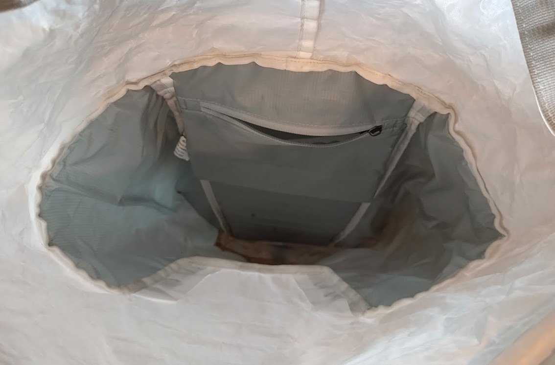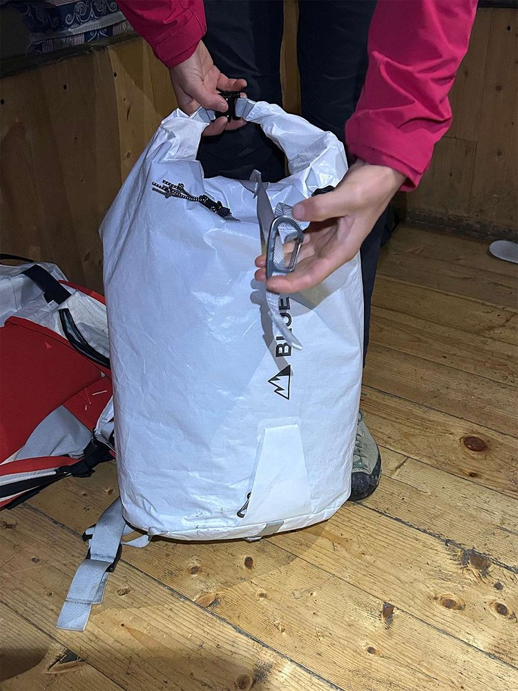Es gibt im bzw. am Alpin Hauler nur eine Tasche mit Reißverschluss, diese liegt innen im Rucksack. Die Pickelbefestigung ist sehr gut, die Geräte für Eis und Schnee haben bei uns immer gut gehalten, die Klingen kann man überkreuzt in einem Aluula-Einschubfach schützen. Der Rollverschluss an der Hauptöffnung ist auch mit einer speziellen Schnalle ausgestattet und top. Das extrem leichte Aluula-Gewebe macht den Rucksack Innenraum angenehm hell, naturgemäß werden weiße Rucksäcke außen schneller dreckig als schwarze (der Dreck ist derselbe, auf Weiß sieht man diesen aber besser).