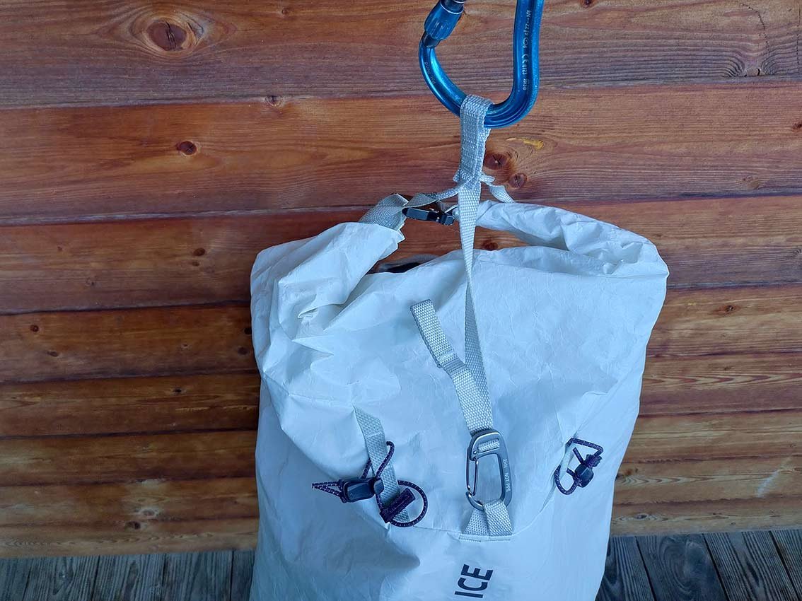Alpine Hauler, da denkt man unweigerlich an einen Haulbag und auch dafür ist der Blue Ice AlpineHauler konzipiert. Die Schulterträger kann man unten ausklippen und im Rückenteil komplett verstauen (der Bauchgurt lässt sich leider nicht abnehmen), oben sind zwei Ösen für das Haulband (welches sonst primär als Seilbefestigung verwendet wird) und schon kann man den Pack wie einen Haulbag nachziehen. Oben einen Karabiner eingehängt, schwebt der Pack an einem Drei-Punkt-System in der Luft. Der Alpin Hauler kann im sehr vollen Zustand auch als Duffel verwendet werden, hat er doch am Boden eine große Halteschlaufe (Decke und Boden mit Schlaufen).