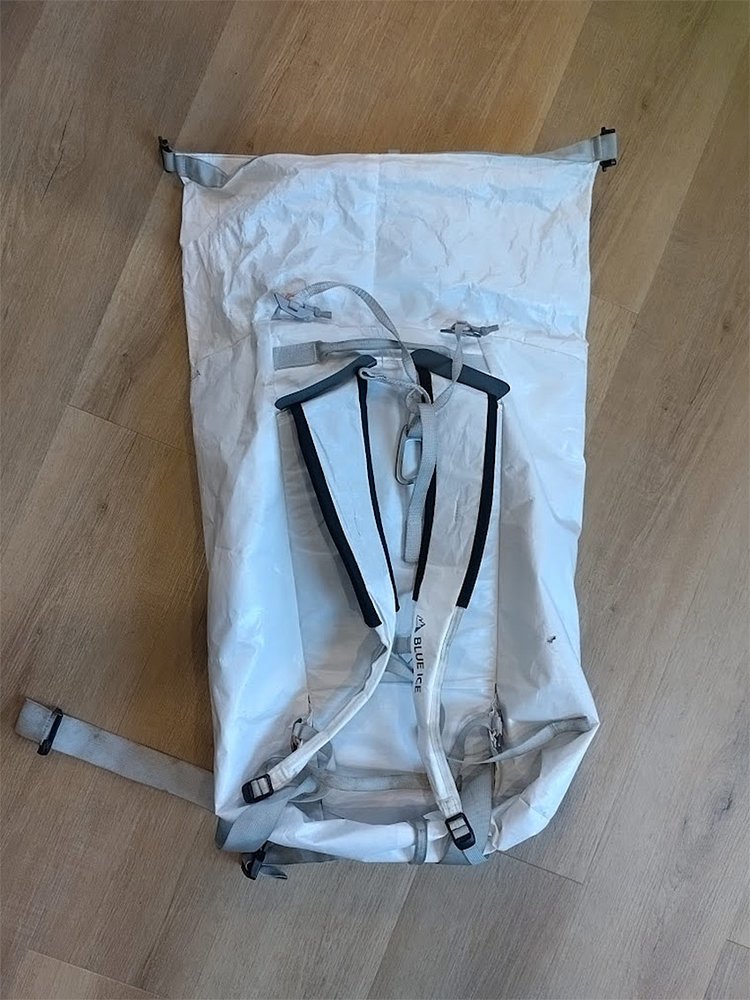 Auf den ersten Blick schaut der Blue Ice Alpine Hauler Rucksack etwas unförmig aus und das Außenmaterial raschelt im Neuzustand etwas ungewohnt. Der Alpine Hauler ist ein im Volumen sehr flexibler Rucksack, komplett ausgefahren gehen gute 45 Liter in den weißen Sack. Wenn ganz voll gestopft kann man den Alpin Hauler oben mit der Haulschlinge verschließen, man muss ihn nicht einrollen und gewinnt noch etwas mehr Platz. Die Schulterträger sind gepolstert, der Tragekomfort könnte aber - nur bei voller, schwerer Füllung - etwas besser sein.