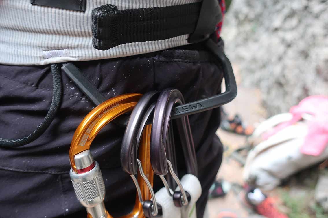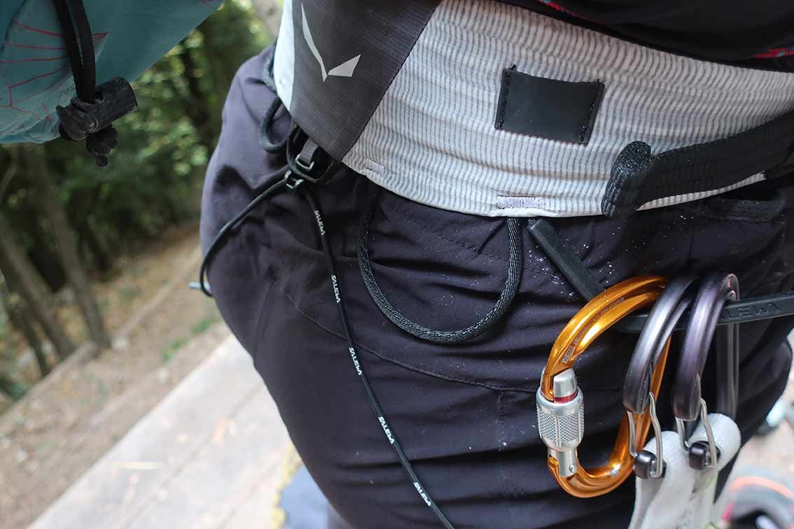 Vom Hersteller Salewa werden 270 Gramm Gewicht für den NXT Klettergurt genannt, das ist nicht absolute Weltspitze, aber für diese Art von Hüftgurt durchaus herzeigbar (unser NXT in Größe S kommt auf der Küchenwaage inkl. angenähtem Mini-Manual auf 278 Gramm). Um auf diesen Wert (mit der Doppelschnalle) zu kommen, wurden bei den Materialschlaufen hinten deutlich dünnere Materialien eingesetzt. Da die Expressschlingen aber auf einer sehr gut konzipierten Plastikschlaufe hängen, hat man beim Klettern keine Nachteile. Die zweite Schlaufenreihe ist mit einer dünnen "Reepschnur" ausgeführt, dort hängen aber meist nur Standkarabiner und mobile Sicherungsgeräte.