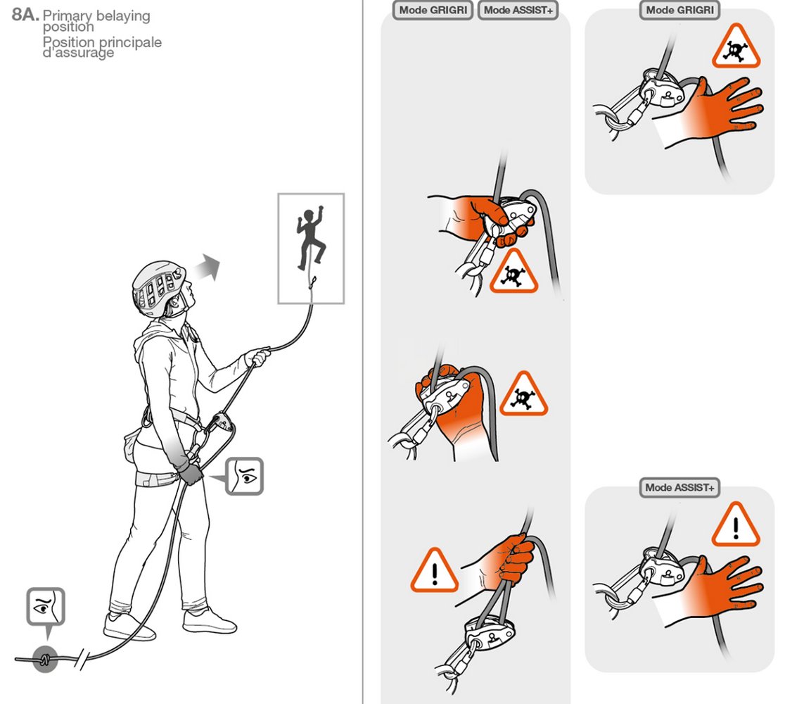 Ein Blick in die Gebrauchsanweisung verrät auch den Sicherheitsvorteil des Top-Rope-Modus (im Manual als Mode Assist + bezeichnet). Da ist zum ersten Mal nur ein rotes Rufezeichen und eine rote Hand, was natürlich auch suggeriert, dass man die Hand nicht vom Seil nehmen soll. Es ist aber kein Totenkopf daneben, dieser ist nur im Mode Grigri - also bei nicht in den Toprope Modus umgestellten Gerät - zu finden. Also ist das Grigri + im Top-Rope-Modus (Mode Assist +) durch die Klemmwirkung sicherer als andere Halbautomaten beim Toprope-Klettern.