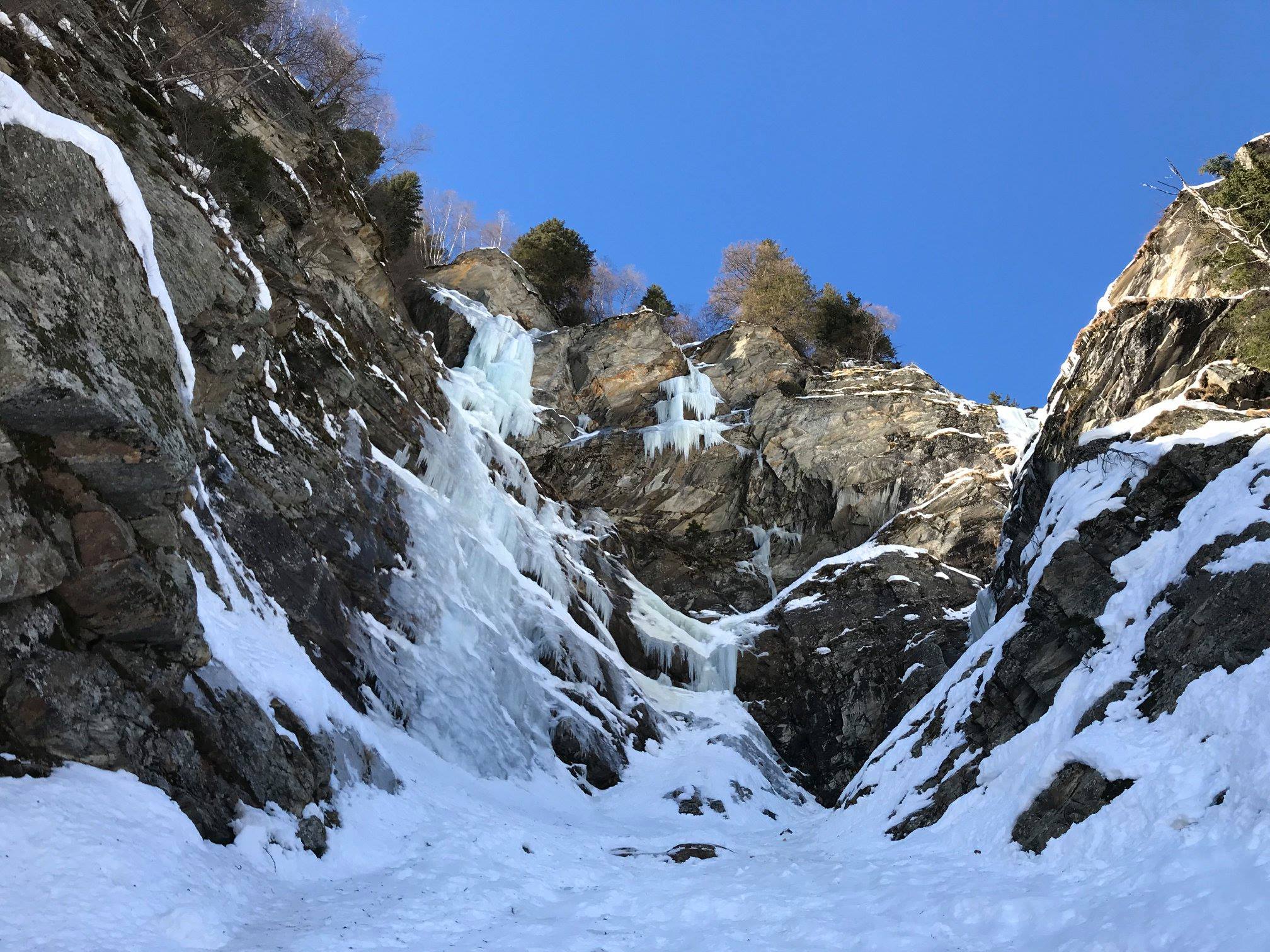 Die Route befindet sich an den Steinwandfällen, zwischen Homozack und Rechten Steinwandfall. Eine kurze, nette Mixedlänge führt zum Beginn des steilen Daches. Athletische Kletterei an guten und teils schlechten Hooks führen zum dünnen Zapfen nach rechts oben. Die Eislänge ist nochmal steil und exponiert.