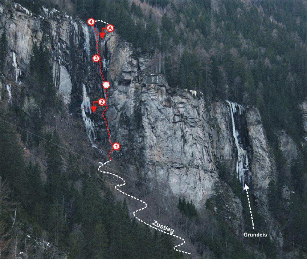 „Aug um Aug“ ist einer der schönsten Eisfälle im Maltatal. Der Ausdruck „Eisfall“ trifft es eigentlich nicht so richtig, „Gully“ wäre die treffendere Bezeichnung. Die Schwierigkeit der Route ist sehr stark abhängig von den aktuellen Verhältnissen, deshalb sollte an dieser Stelle erwähnt werden, dass die Bewertung stark variieren kann! Großartige Tour, sehr lohnend!