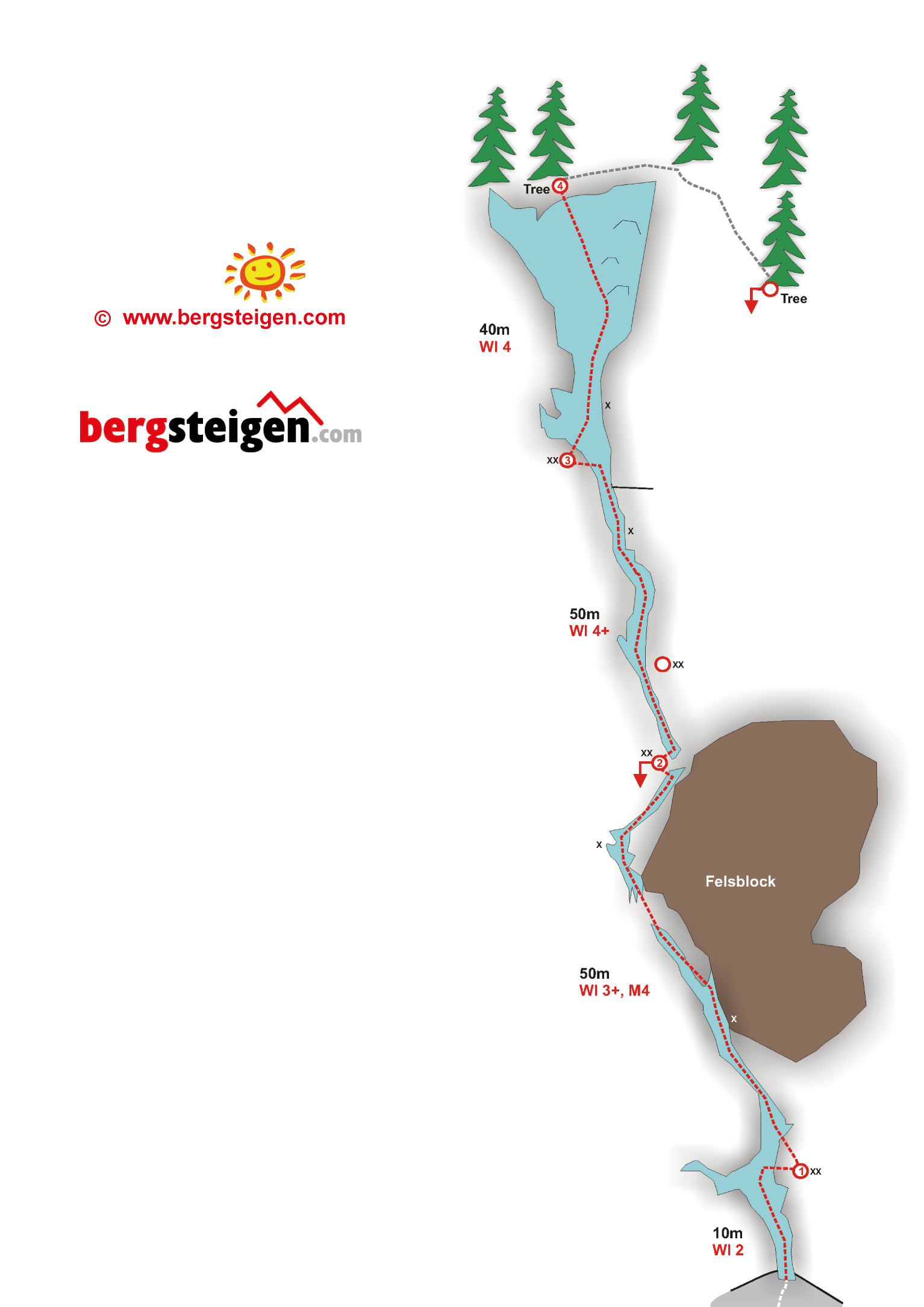 Vom Parkplatz geht man hinunter zum Maltafluß, wo ein Weg talauswärts führt. Ein paar hundert Meter weiter führt eine kleine Brücke über den Bach. Noch ca. 150 Meter talaufwärts, nun nach rechts in unwegsames Gelände abbiegen. Über einen Blockkegel ca. 100 Höhenmeter zum Einstieg: Dieser befindet sich am höchsten Punkt in der Verschneidung. ( Siehe Übersicht)