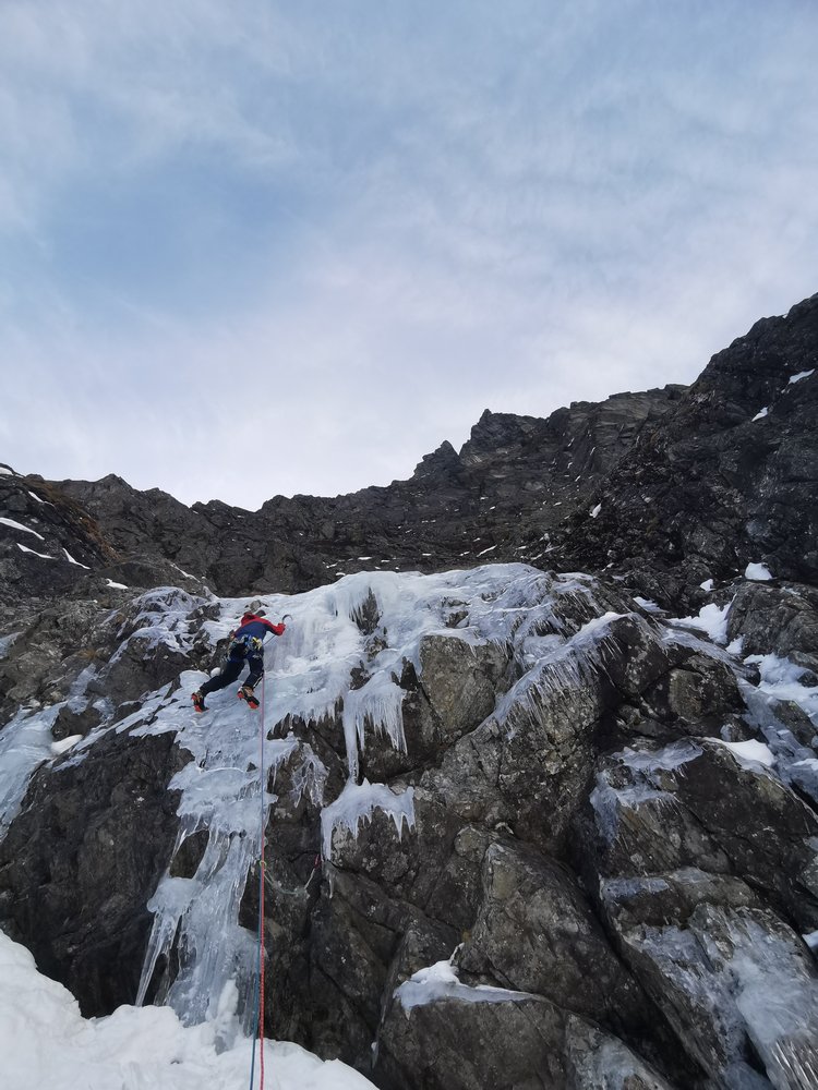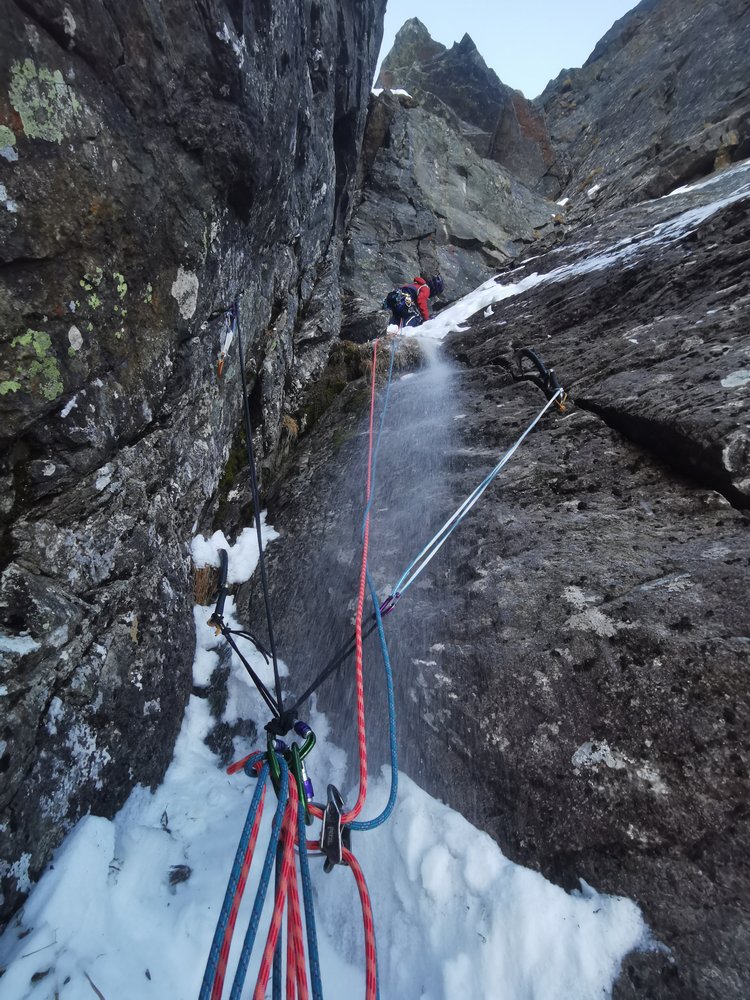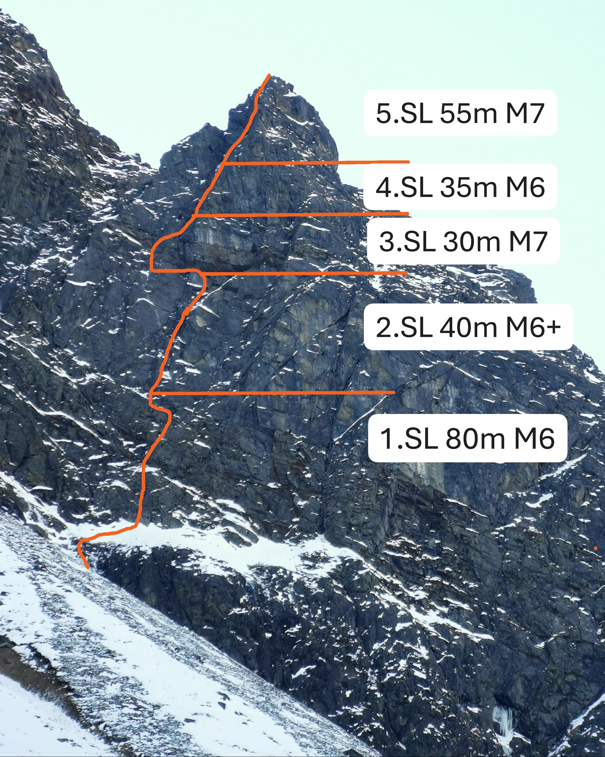 1.SL 80m M6, Einstieg an Eisfall (5m WI2) über Schneefeld, bei Bohrhaken stumpfer Verschneidung folgen. An BH auch Stand möglich (dann 2SL je 40m). Am Ende der Verschneidung links halten zu Stand an 2 BH