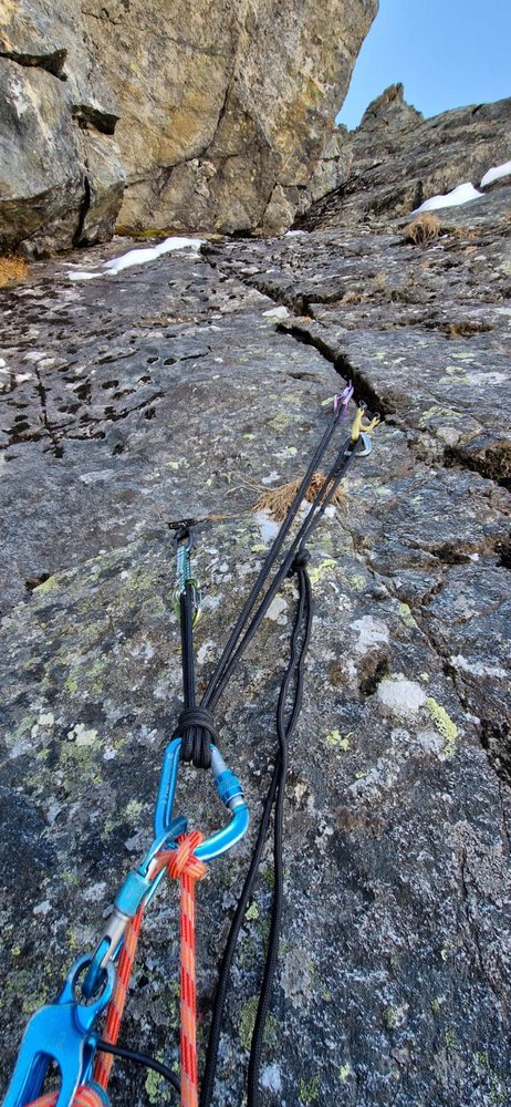 3.SL 30m M7, Quergang nach links, 5 meter hoch zu Schlaghaken, Quergang nach rechts bis in Verschneidung Stand an sehr gutem Riss.