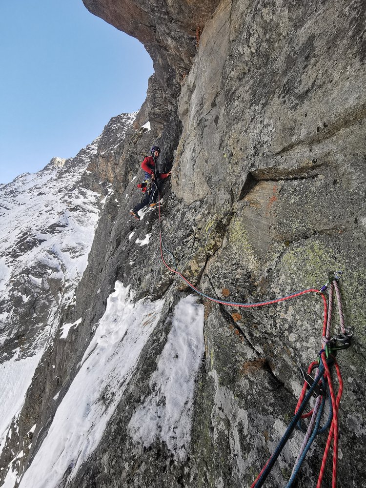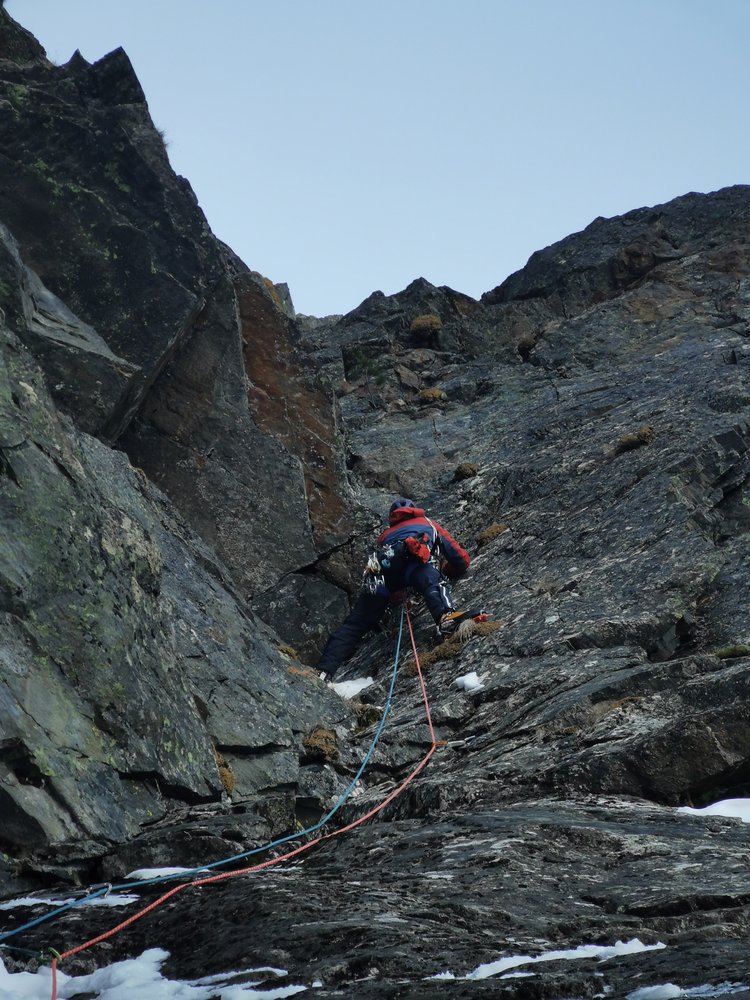 5.SL 55m M7, An Risschuppe leicht rechts weg. Bei Ende gerade hoch zu Fixkeil. Nach steilem Teil weiter zu Gipfel.