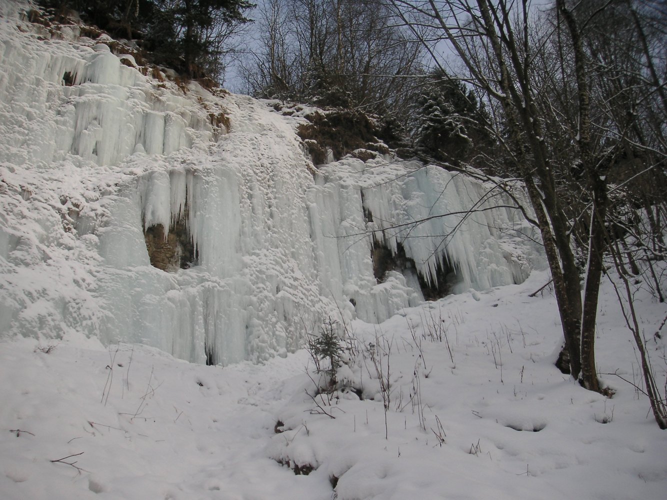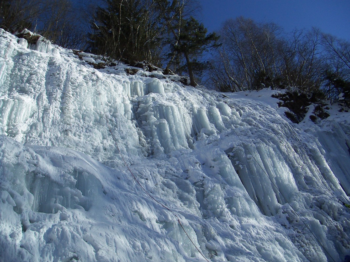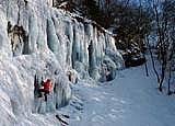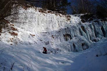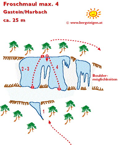 Das Froschmaul ist der ideale Wasserfall, um die ersten Schritte Eis zu wagen. Gute Topropemöchlichkeiten, ein kurzer Zustieg, geringe Lawinengefahr und das sichere Gelände am Fuße des Wasserfalles machen das Froschmaul auch für Kurse esonders attraktiv. Der Fall wird von links nach rechts immer schwieriger, aber auch niedriger. Im linken Teil eignet er sich daher auch perfekt zum Bouldern. Zuletzt sei noch auf die angenehme Nachmittagsonne hingewiesen. Sie macht das Klettern bei tiefen Temperaturen so richtig angenehm. Bei Wärme ist der Fall dadurch leider oft nass. .