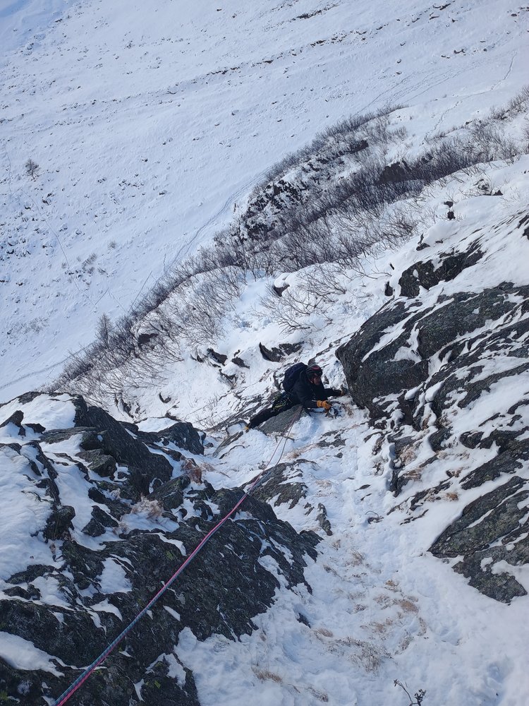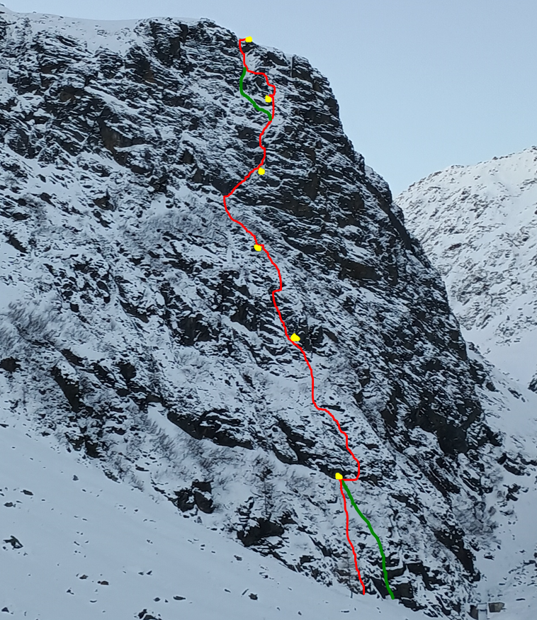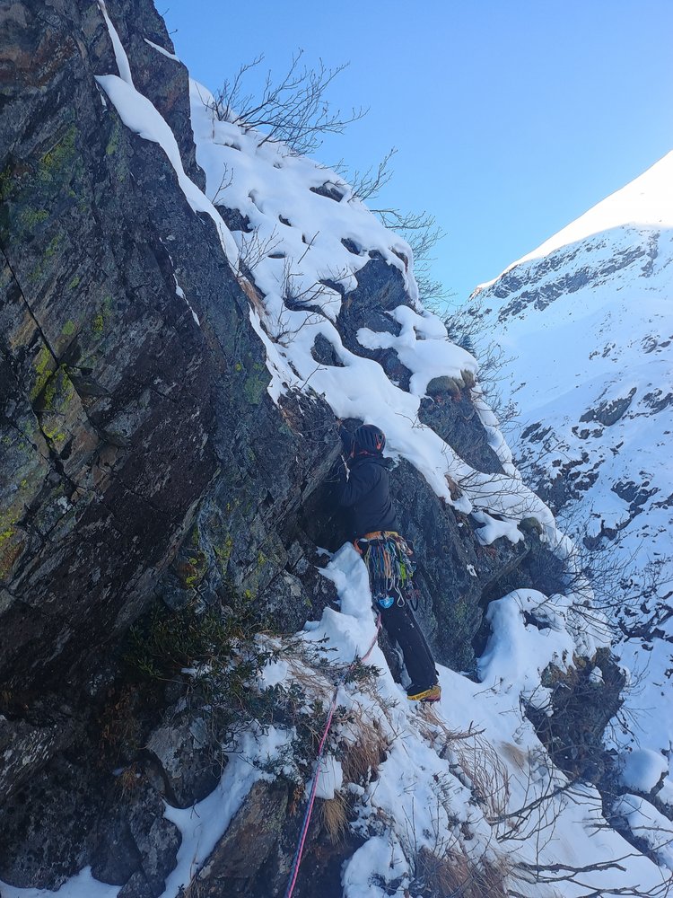 SL1 (50m): Seichte Verschneidung mit Riss, ca. 15m, schlecht absicherbar (M5+?). Diese nach links verlassen und hoch in die Schrofen (ggf. kurz Eis, 10m). Weiter durch die Büsche schräg rechtshaltend aufwärts, bis zu einem kleinen Felsband (30m). Stand an 2 Schlaghaken.