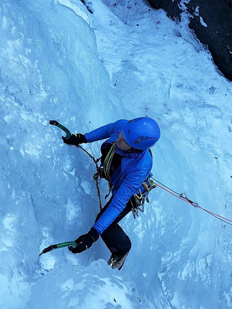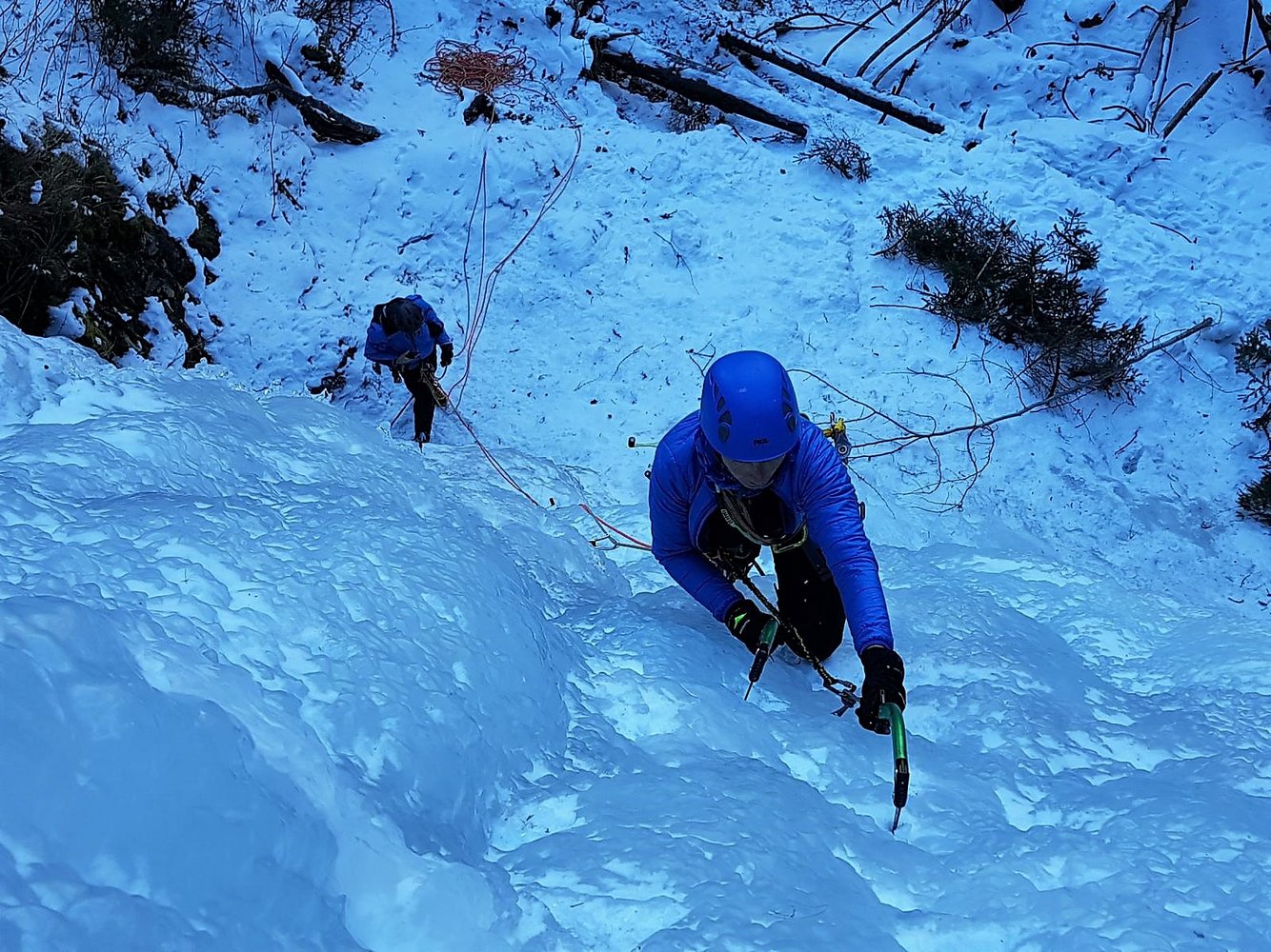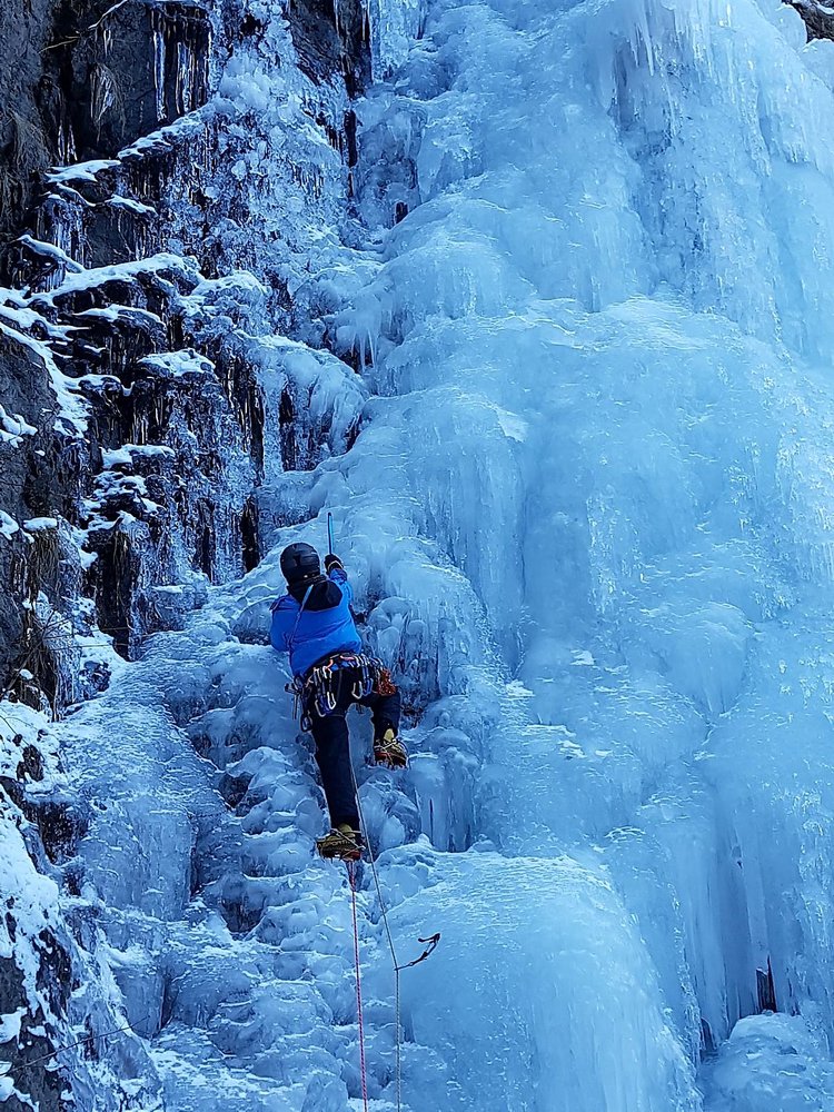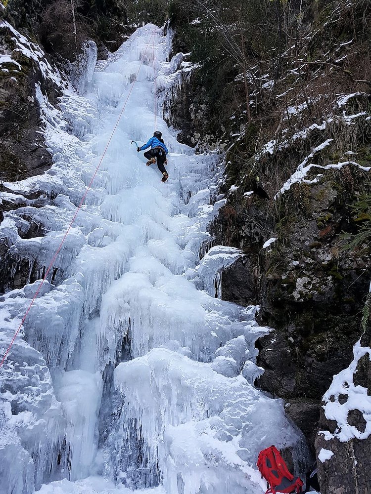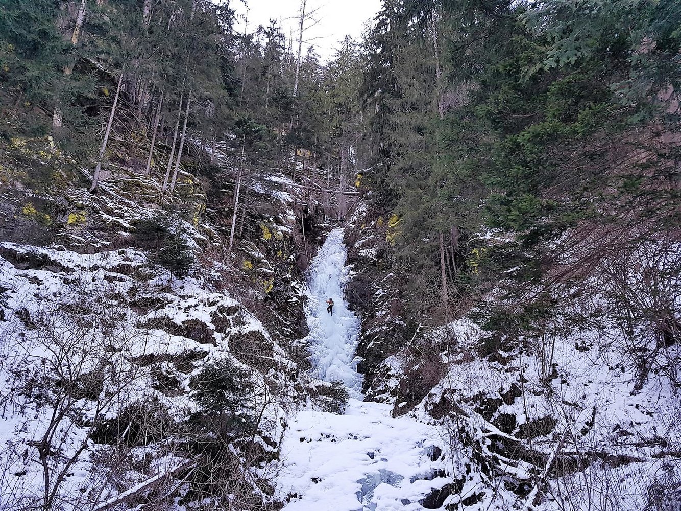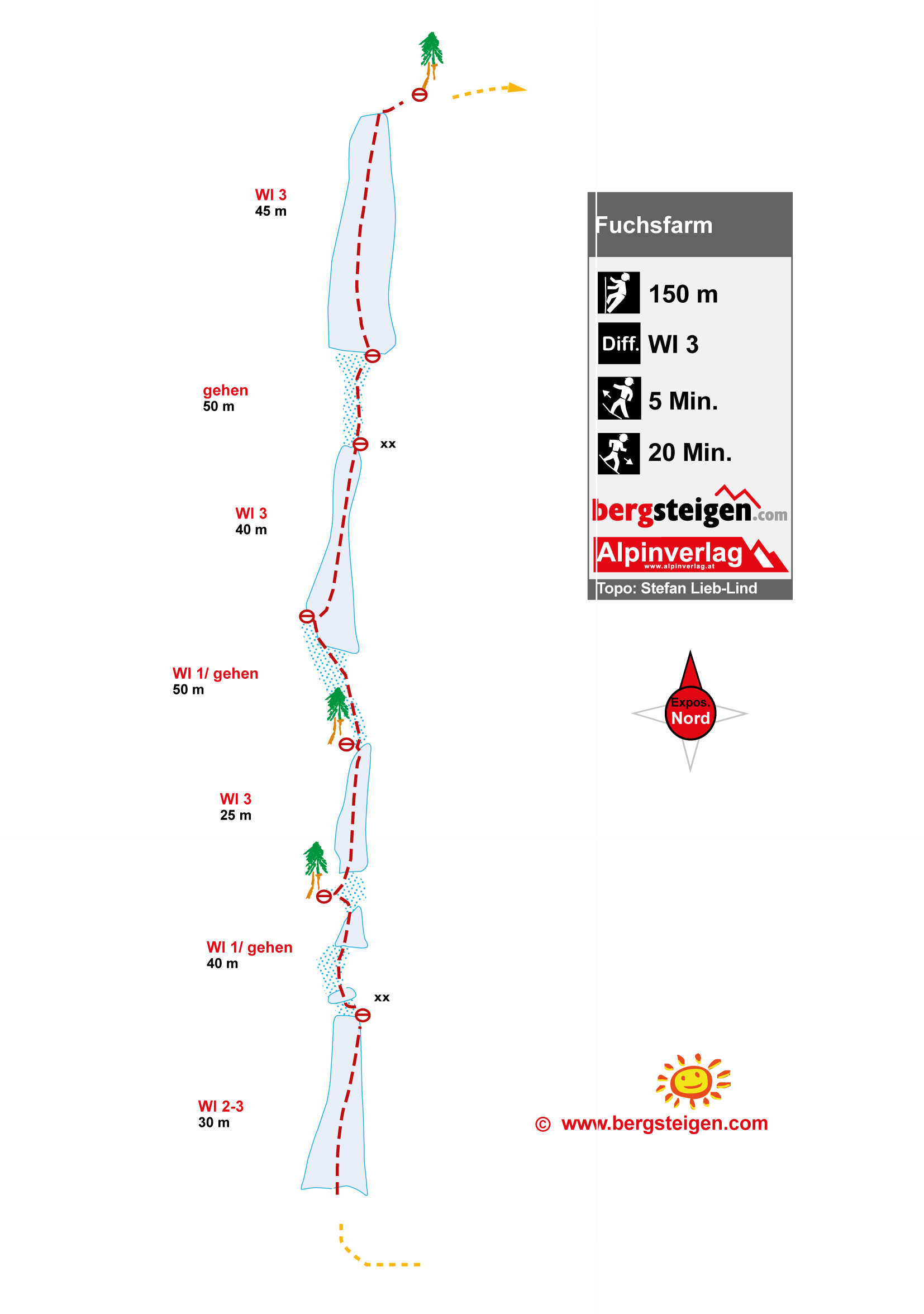 Die „Fuchsfarm“ ist ein schöner gestufter Eisfall, bei dem sich schöne  Eislängen und Gehelände immer wieder abwechseln. Guter Eisfall für Anfänger, jedoch gar nicht so kurz. Vernachlässigbare Lawinengefahr.
