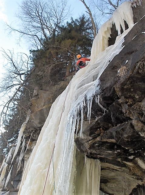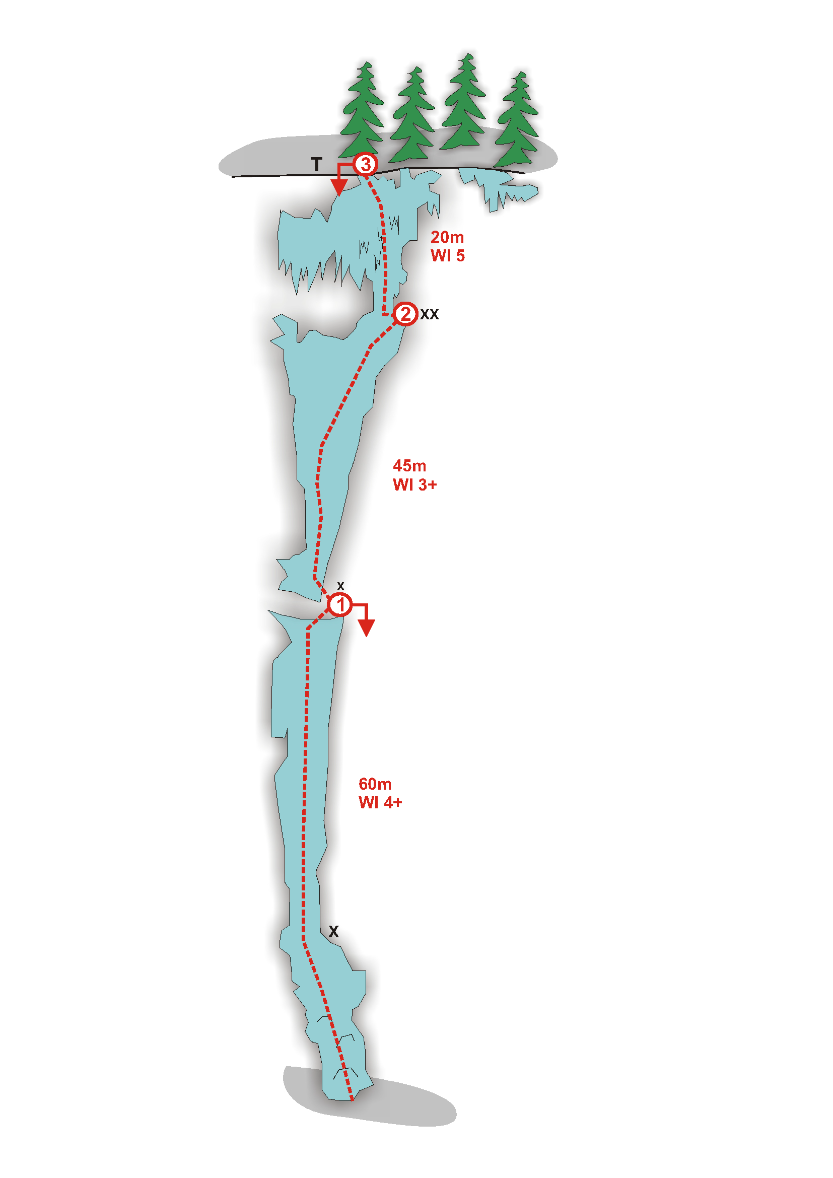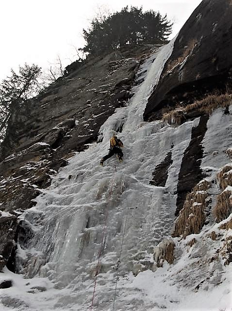 Ein weiterer wunderbarer Eisfall im Sektor „Taleingang“. Der „Hochzeitsmarsch“ strahlt einen regelrecht an, wenn man noch im Auto sitzt und zu ihm hinüberblickt. Wie bei den übrigen Eisfällen im Sektor auch, ist die Route stark von niederschlagsreichen Herbsttagen abhängig. Gerade die erste Seillänge ist oft nur sehr dünn und daher schwer abzusichern. Wem die 3 Seillängen nicht genug sind, der kann noch die eine oder andere Tour in der näheren Umgebung anhängen, z.B. „Kobold“ (WI 5) oder „Aug um Aug“ WI 4+.