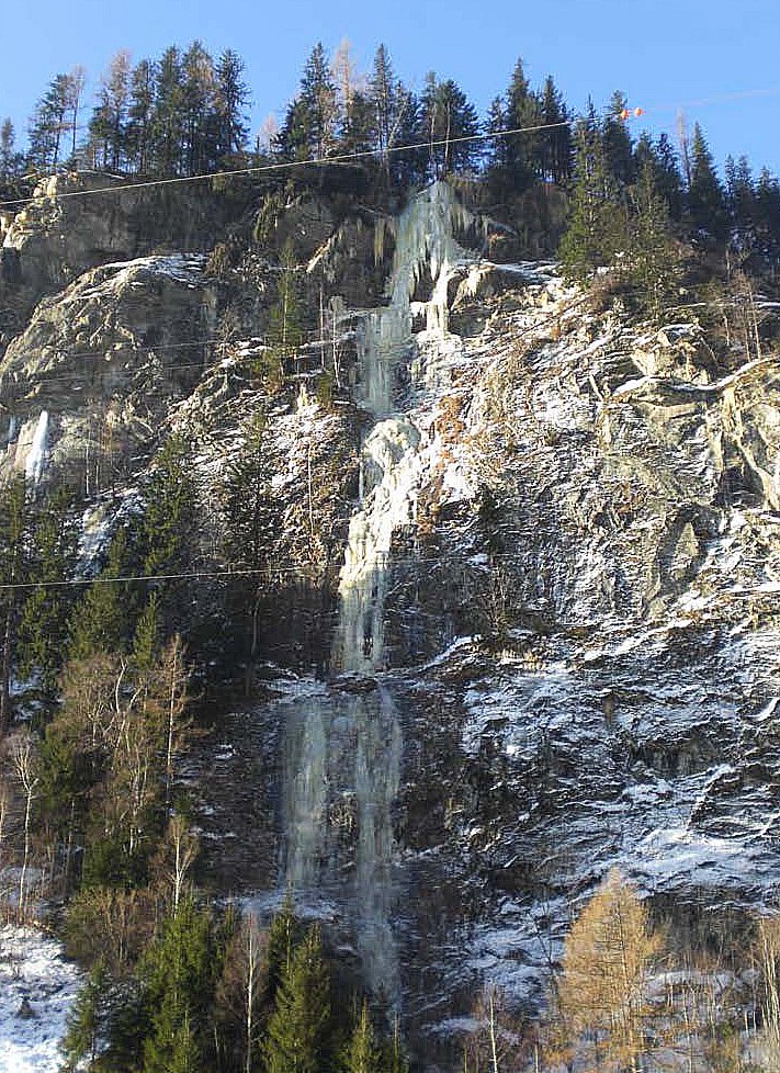 Wenn er steht, Betonung auf WENN, einer der besten Eisfälle im Tal. Sehr homogene Schwierigkeiten der unteren drei Seillängen. Wählt man den direkten Ausstieg, muss man sich schon ganz schön festhalten. Es gibt jedoch auch eine leichtere Umgehungsvariante rechts. Typisch für den Eisfall ist seine blau- braune Farbe, die er vom Eintrag aus dem umgebenden Erdreich erlangt. Der Kerschhacklfall baut sich nur sehr selten auf, also zuschlagen, wenn es soweit ist!