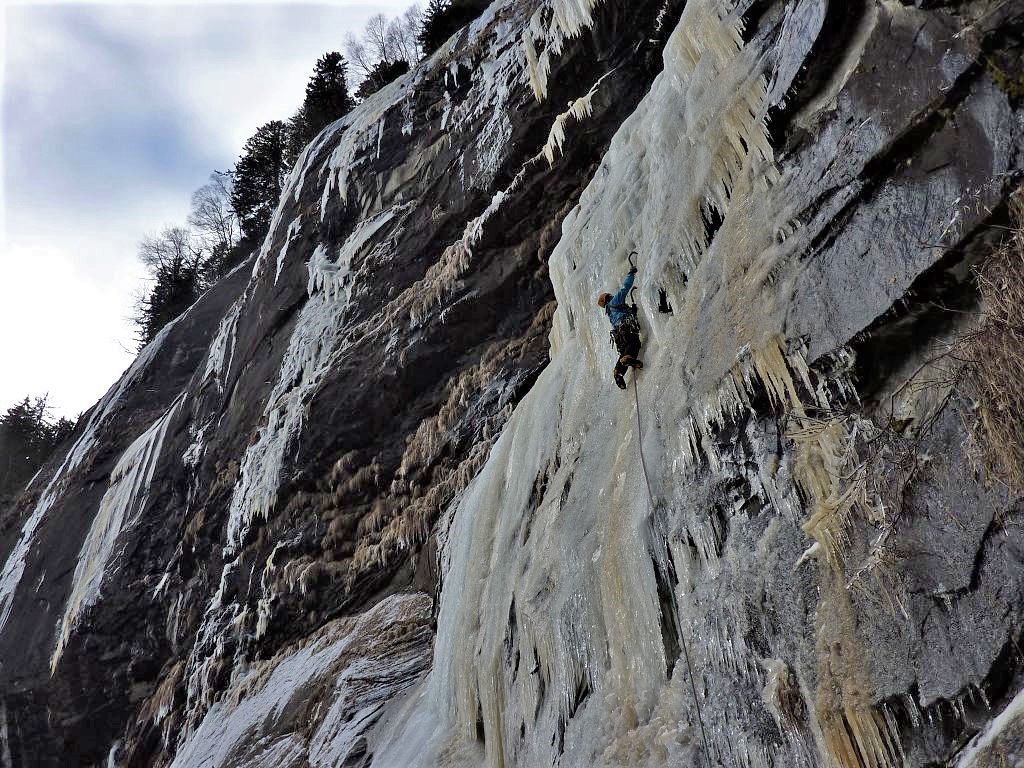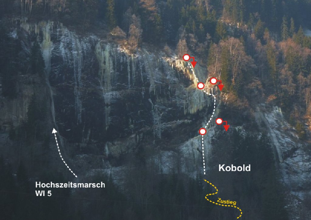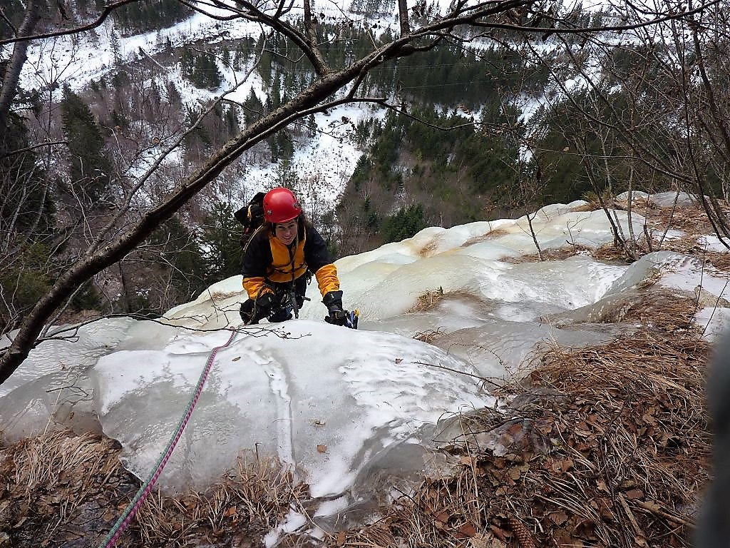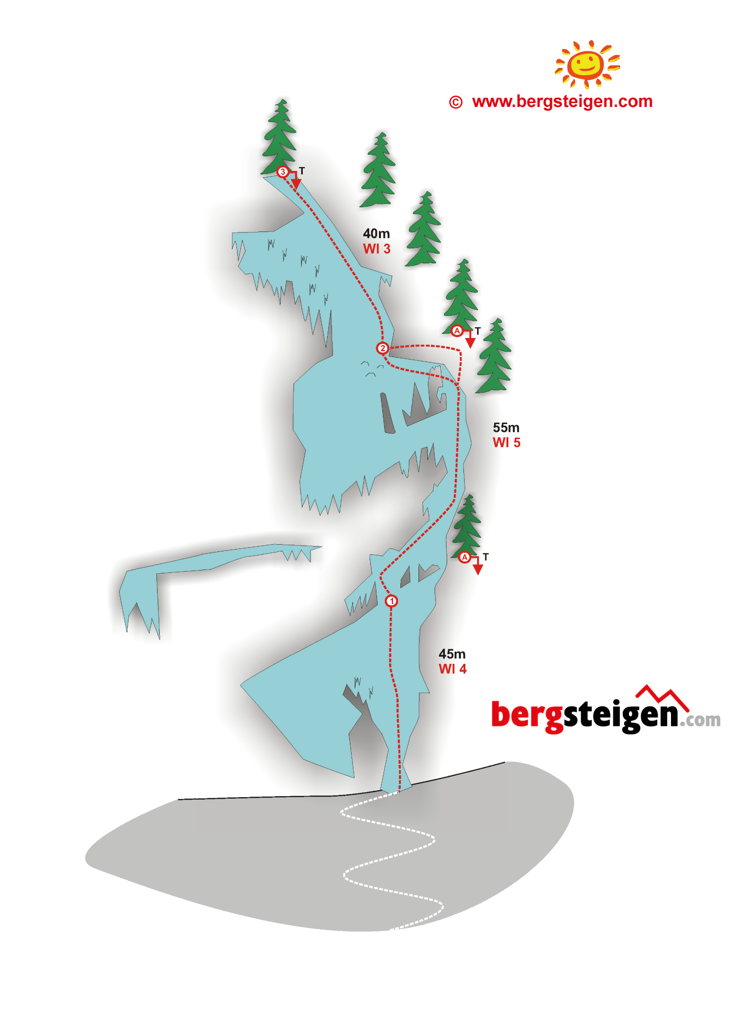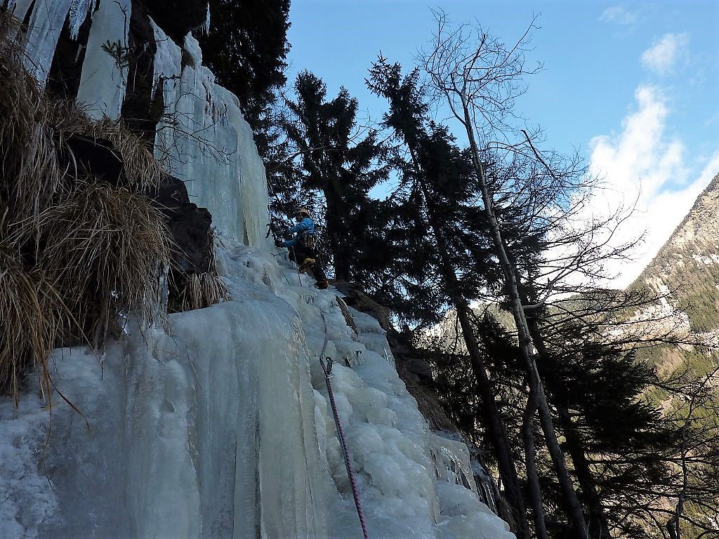 Von der Straße aus gesehen eine etwas unscheinbare Linie, die oft knapp am Waldrand zu gehen scheint. Dabei bietet der Wasserfall eine echt lustige und interessante Kletterei. Die Schwierigkeit macht nicht die Steilheit aus, sondern das dünne Eis vor allem in der zweiten Länge (kurze Schrauben mitnehmen, die Seillänge ist fast nur mit kurzen Schrauben absicherbar!). Dafür steht auch das M bei der Schwierigkeit. Den Mixedquergang am Ende der zweiten Länge kann man auch umgehen, indem man noch ein paar Meter zum Baum hinaufsteigt und dann oben auf Gras ein paar Meter nach links quert.