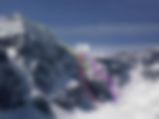 Vom Gipfel den Gipfelhang zurück absteigen/abfahren auf der Aufstiegsspur (später im Jahr oft blank) bis zu der Einsattelung, zu der von rechts der Normalweg durch eine Firnrinne hochzieht.