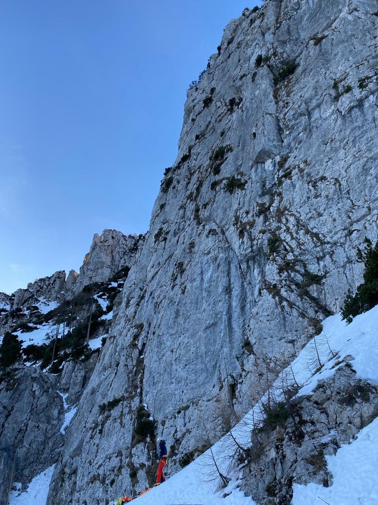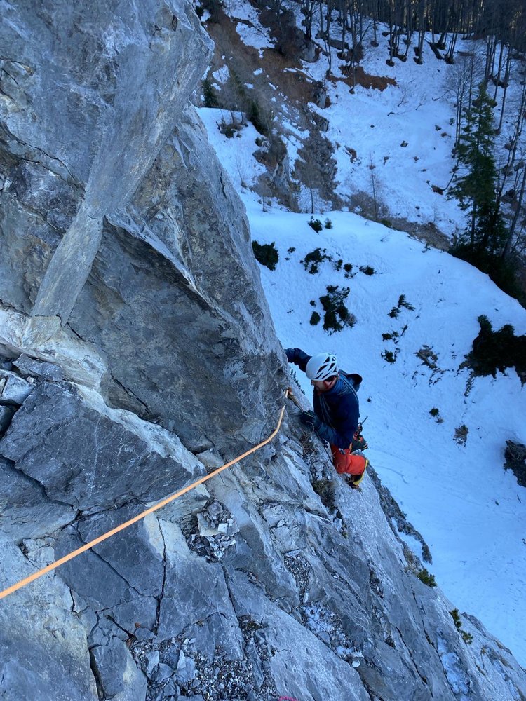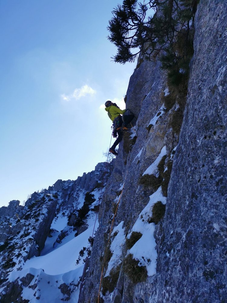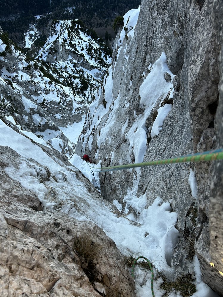Am besten über Steinerne Jäger retour, wobei man hier nicht am Einstieg vorbeikommt.  Hierfür ca. 15 hm zu Steig absteigen und orographisch nach links folgen (tlw. markiert). Alternativ abseilen und über Rinne nach unten (1. Pfeiler kann orographisch links über Rinne umgangen werden) Bei Felsturm rechts zurück zu Einstieg. Bei sehr wenig Schnee definitiv Abstieg über Steinerne Jäger wählen! Bei viel Schnee und nicht sichtbaren Steig tendenziell über die Tour abseilen, sofern keine Ortskentnis über den Steig vorhanden ist.