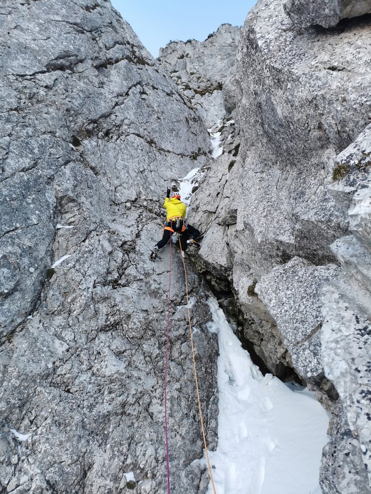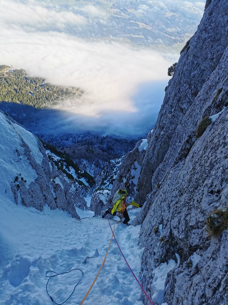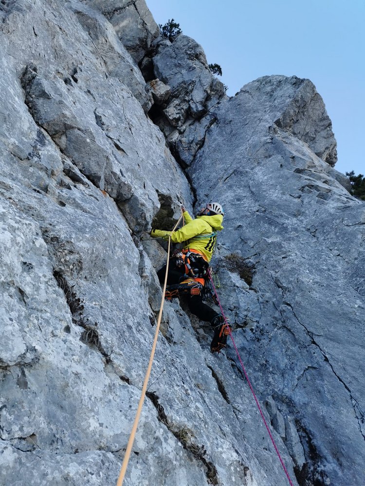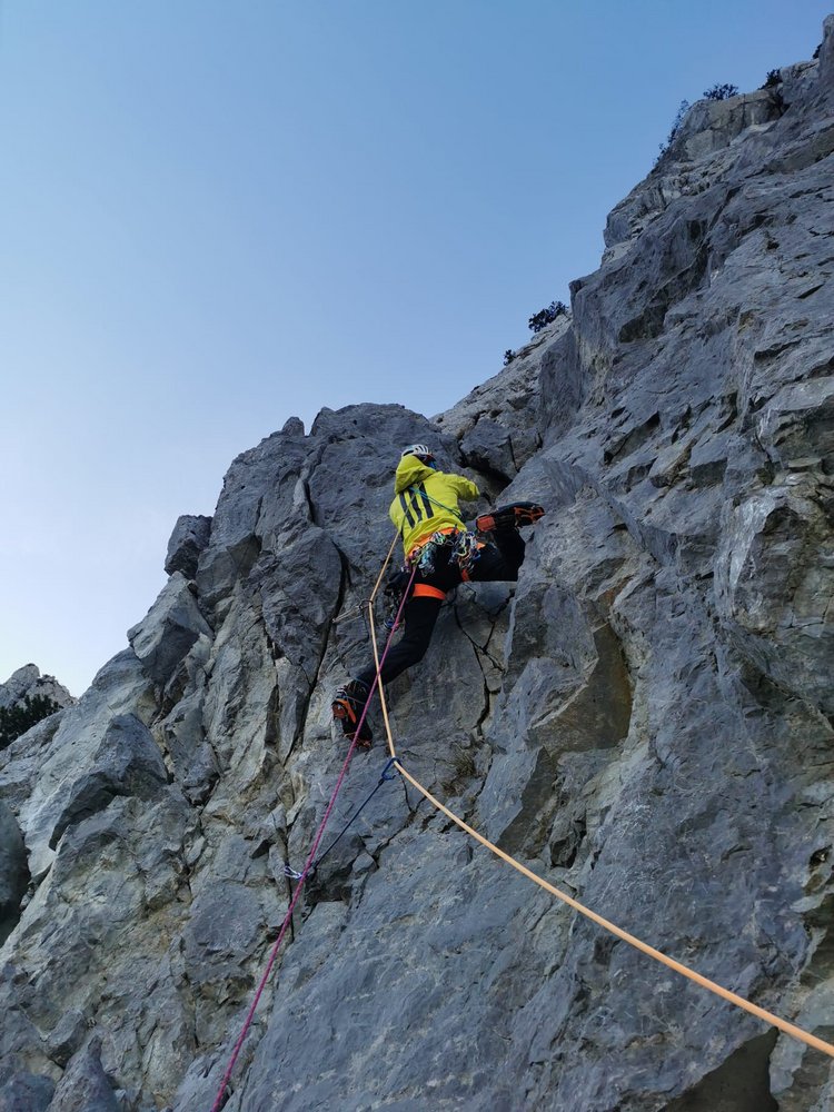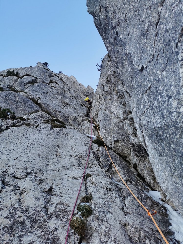 Logische Linie durch zwei Pfeiler, welche über eine Steilrinne verbunden werden. Die Route folgt stetig den vorhandenen Rissen, welche sich meist gut absichern lassen. Da die Felsqualität insbesondere im 1. Pfeiler nicht über allen Zweifeln erhaben ist, sollte eine Begehung in jedem Fall unter dem Gefrierpunkt liegen. Stände durchgängig gebohrt, fixes Zwischenmaterial nur spärlich vorhanden ( 7 BH,  4 NH). Insofern ist ein solides Können im kombinierten Gelände zwingede Voraussetzung.