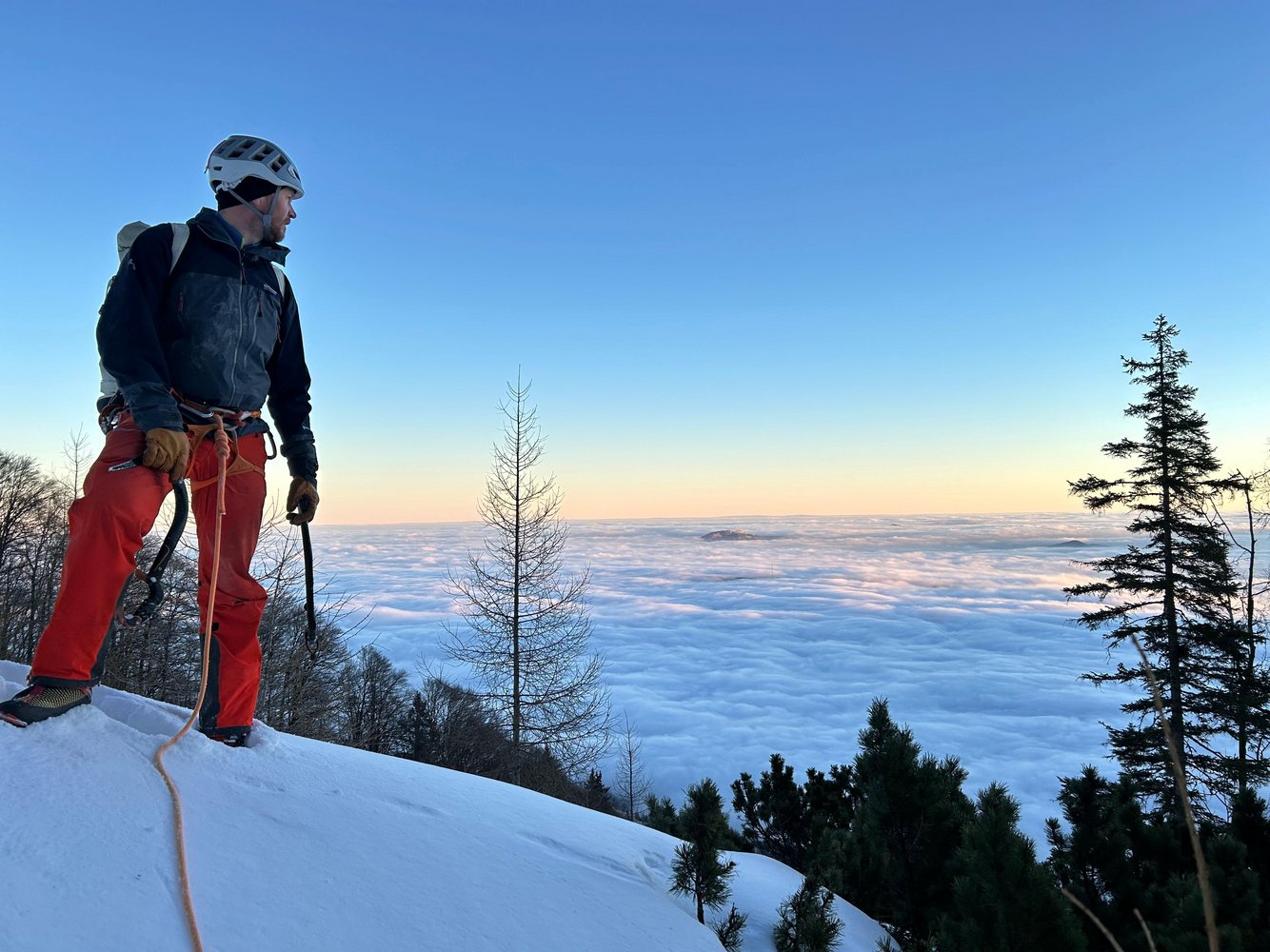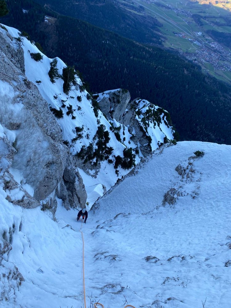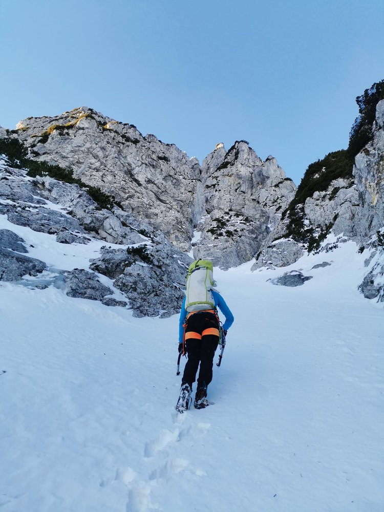 Eine Begehung ist nur unter dem Gefrierpunkt sicher. Auf gute Verhältnisse warten - gesetzter Schnee und keine Lawinengefahr als Grundvoraussetzung. Es darf ein kompletter Klettertag kalkuliert werden. Der Zustieg sollte somit zeitig erfolgen.