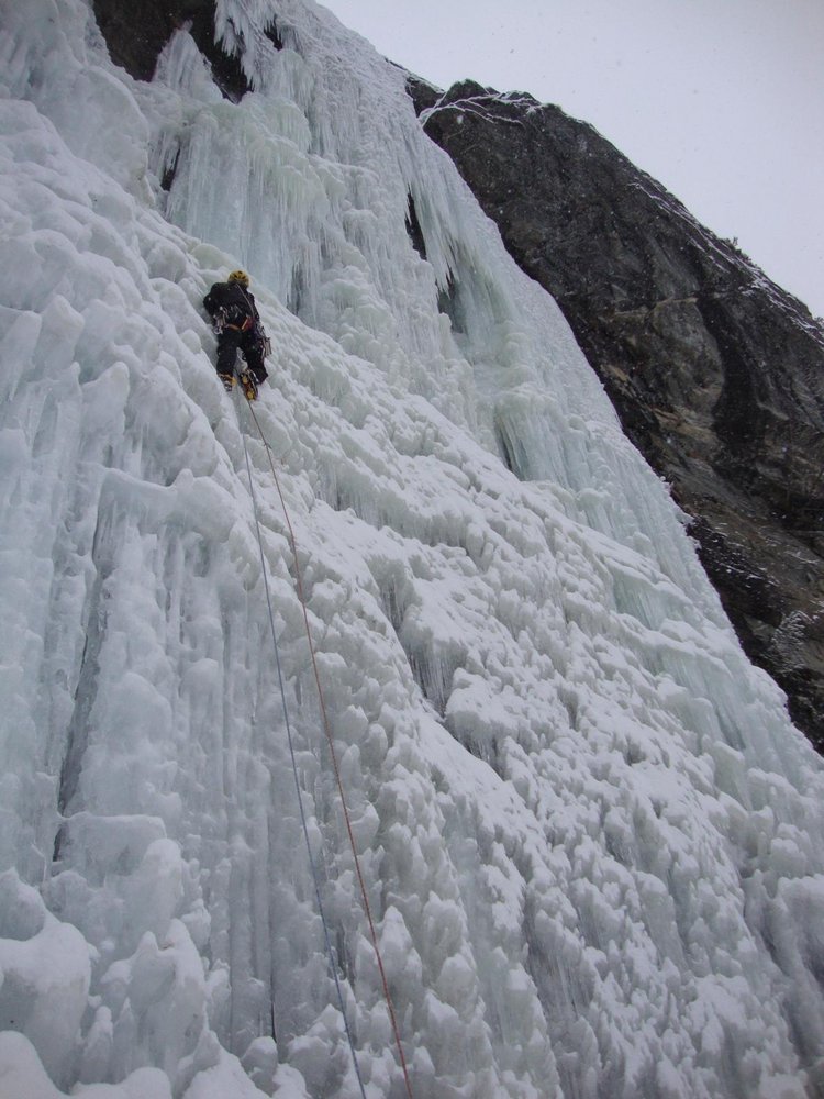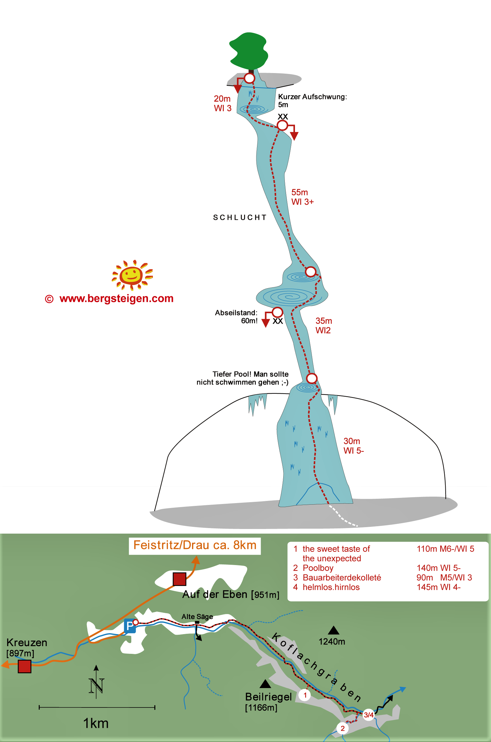 Dass der Koflachgraben ein landschaftliches Kleinod ist, ist unbestritten. Dass es hier aber auch richtig lässige Eisklettertouren gibt, ist recht neu. Neben Bauarbeiterdekolleté, Helmlos-Hirnlos und the sweet taste of the unexpected ist Poolboy ebenso ein kleiner Eiskletterschatz, den es zu machen gilt. Der Zustieg ist etwas länger und komplizierter als bei den anderen Touren, jedoch zahlt es sich auf jeden Fall aus. Die erste Länge über den massiven Eisaufbau ist die Schlüssellänge. Jedoch sollte der Pool an der Kante oberhalb auch nicht unterschätzt werden. Bei zu dünnem Eis soll es schon vorgekommen sein, dass einer der Erstiegener baden gegangen ist :-) Oben weiter führt die Route in eine Schlucht, was das Erlebnis in Summe sehr abwechslungsreich macht.