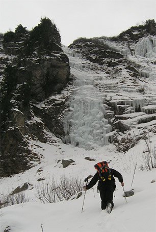 Von der Jausenstation mit Ski (ohne etwas länger) zum Einstieg des gut sichtbaren Eisfalles.