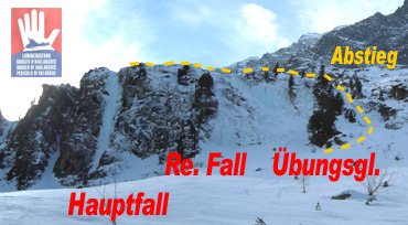 Vorsicht: Der Fall befindet sich in einem Lawineneinzugsbereich, somit ist die Lawinensituation genau zu prüfen!