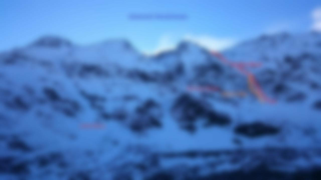 4. SL Die Steilplatte von links 2 BH diagonal nach rechts in heikler Kletterei und ins Eis. Nach 25 m heikler Übergang in flaches Gelände und fast waagrecht weitere 20m zu einem kleinen Fels mit BH Stand in der Rinne. M5, WI 4+