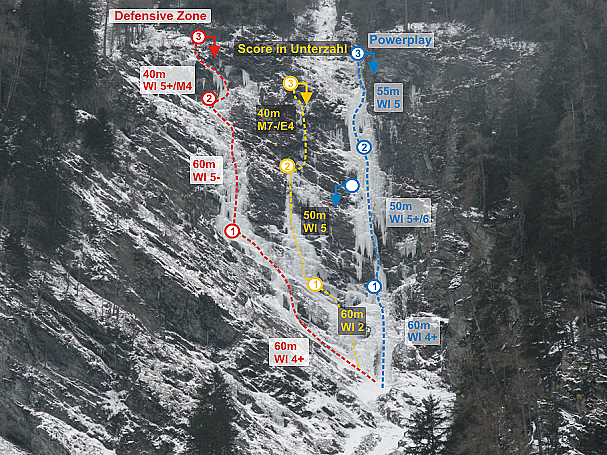 Gewagte Linie, deren Schlüssellänge nicht immer festen Fels zu bieten hat. Trotz der mäßigen technischen Schwierigkeiten, sehr anspruchsvoll zu klettern und abzusichern. Bei unserer Begehung fanden wir am Ende der 2.Seillänge einen Bohrhakenstand mit Karabiner vor. Wir nutzten diesen als erste Zwischensicherung der Mixed-Linie so wie zum Abseilen. Die dritte Länge endet an einem Baum, die Abseilschlinge wurde belassen. Im Gegensatz zu den Touren im hinteren Seebachtal ist der Zustieg hier mit etwa 40 Minuten sehr kamot!