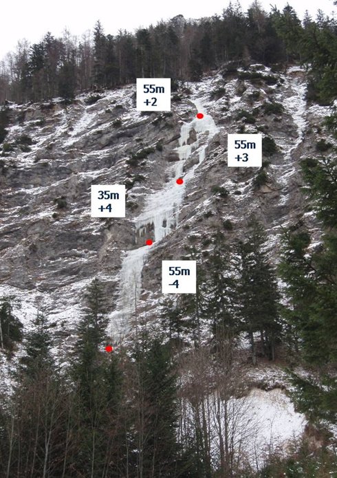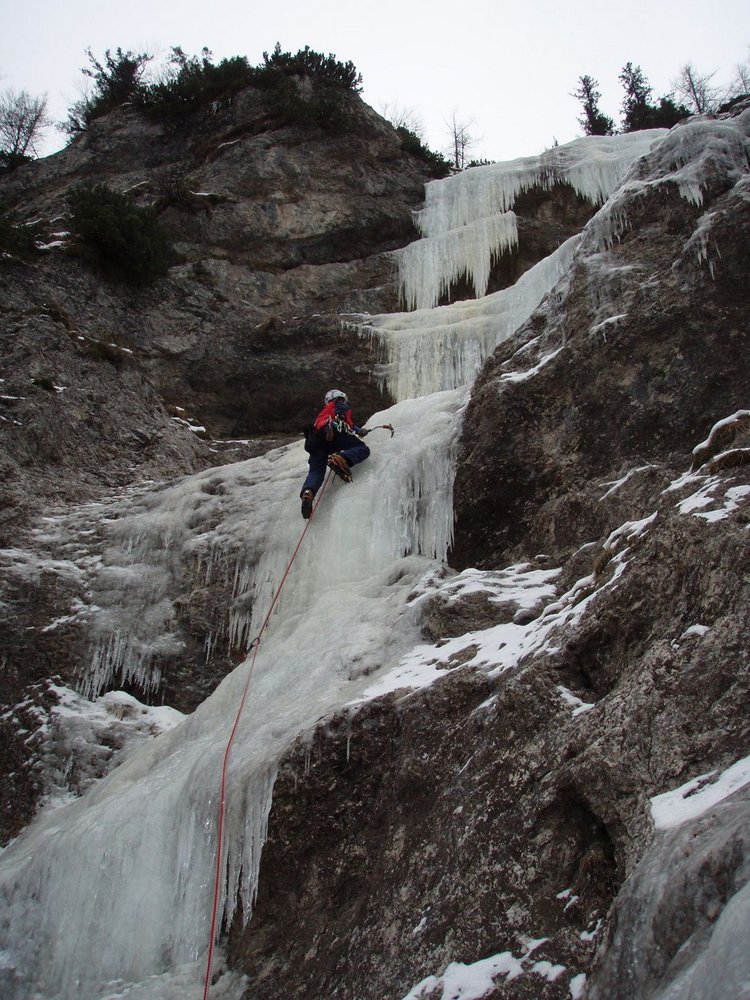 Langer und nur nach längeren Kälteperioden wachsender Eisfall unter dem Sparber bei Strobl. In der 3. SL sind 2 Varianten möglich, wobei die rechte nach einer kurzen steileren Stufe leichter ist.