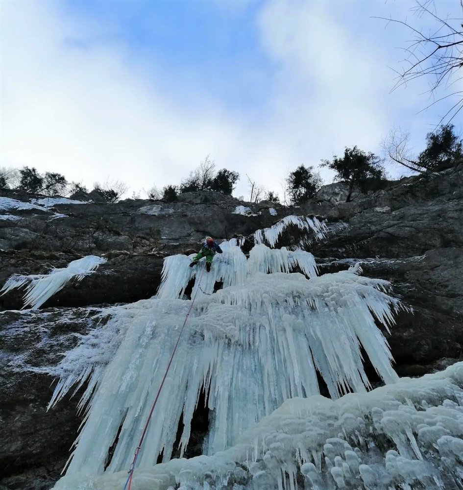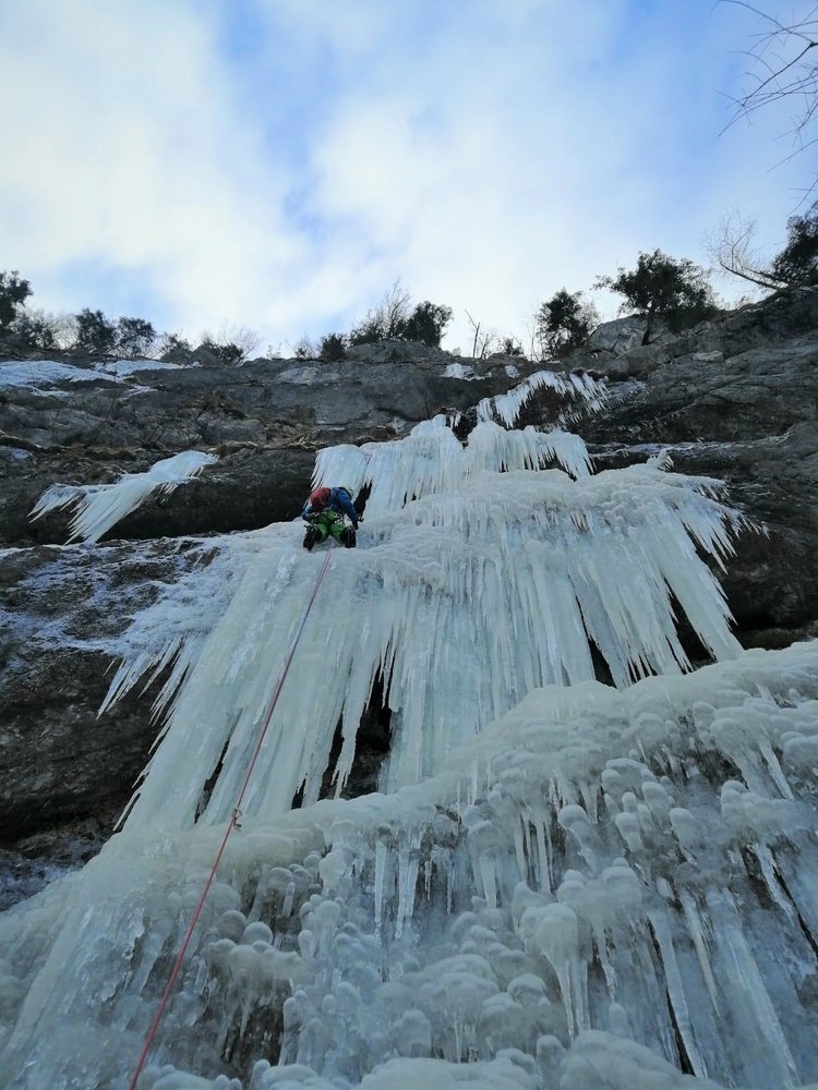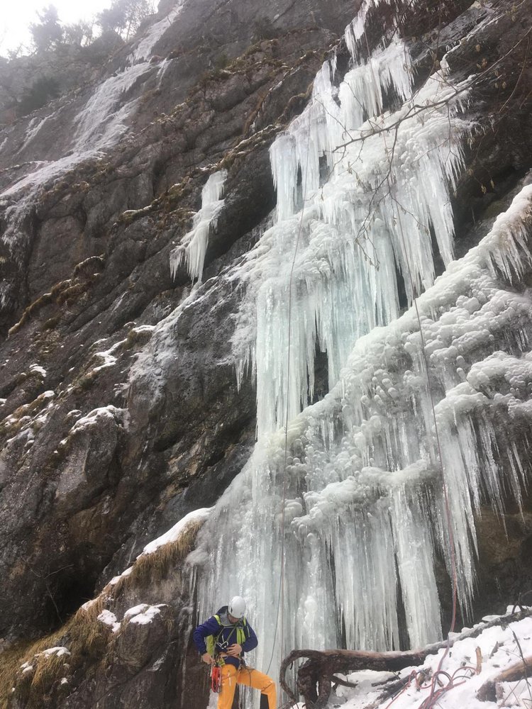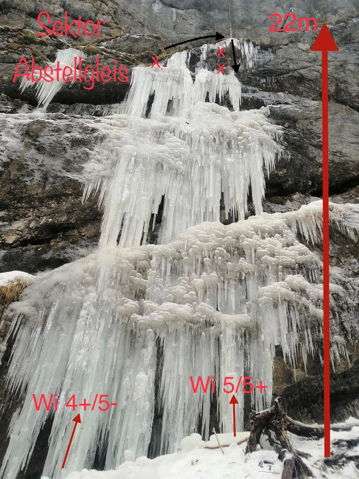 Gleich beim Schranken rechts in den schütteren Wald. Hier sieht man bereits den Sektor mit dem Eis. Steil in ca 10 Minuten zum Wandfuß.