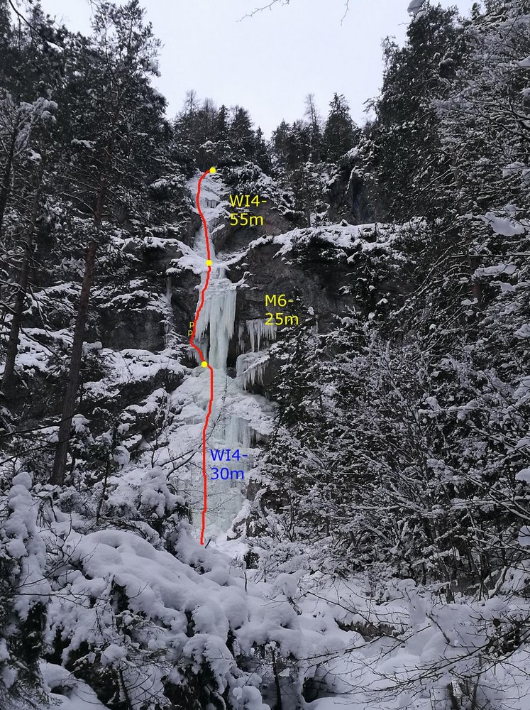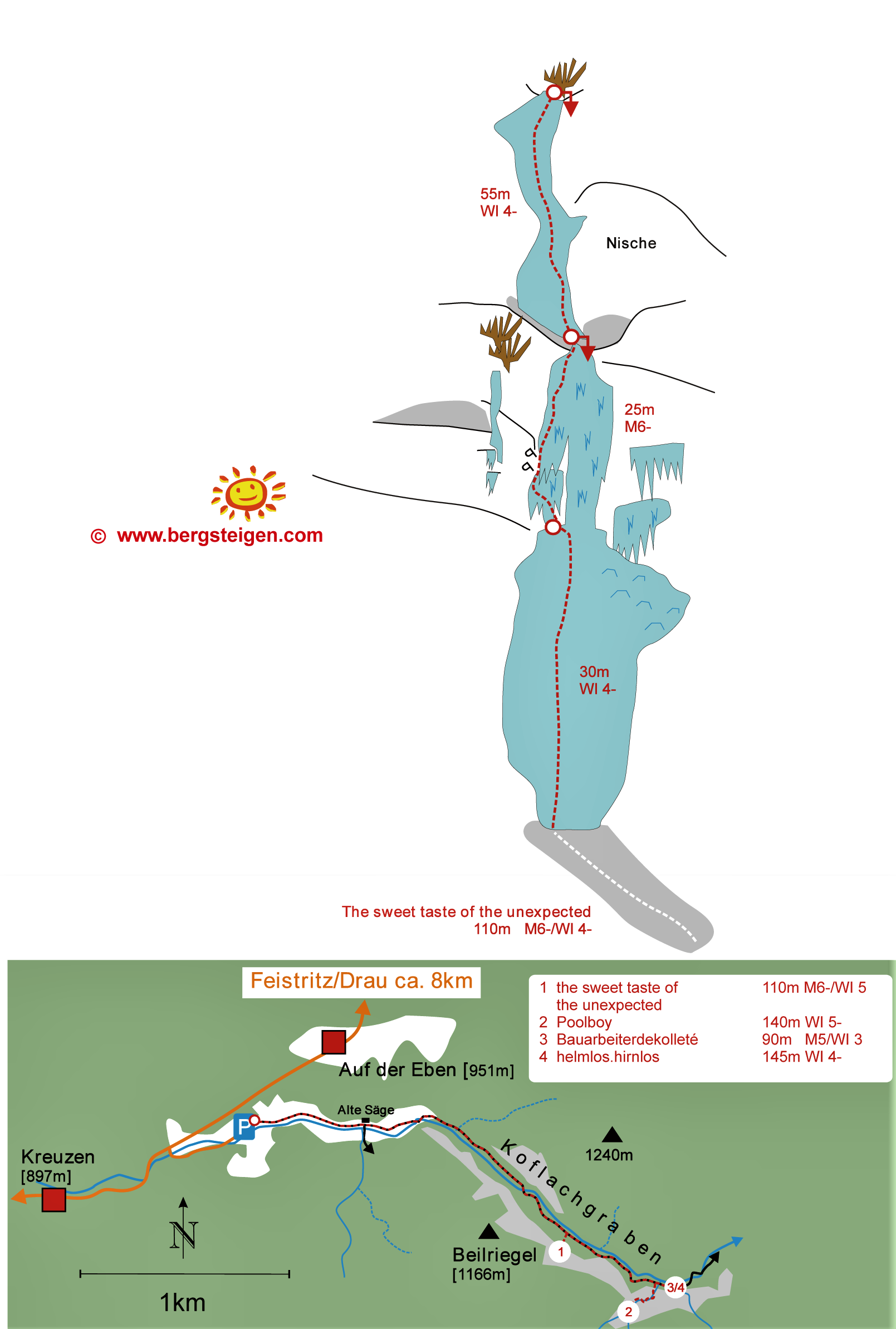 Die Gegend um Paternion ist nicht gerade berühmt für Eisklettertouren. Dennoch verstecken sich im Koflachgraben einige sehr schöne Eisfälle, die aufgrund der Lage mitten im Wald recht lawinensicher sind. Die „The sweet taste oft he unexpected“ ist aktuell die schwierigste der Eisfälle im Graben und ist ein sehr schöner Eisfall mit einer steilen Säule in der zweiten Seillänge. Am Tag der Erstbegehung war die Säule selbst unkletterbar und wurde links über eine kurze Mixedstelle geklettert – die Säule sollte jedoch bei stabilen Verhältnisse nicht schwieriger als WI5 oder WI5+ sein.