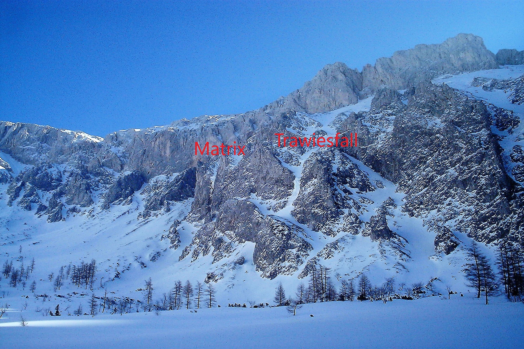 Netter und gut eingerichteter Übungsfall, der meist kompaktes Eis aufweist. Der Zustieg ist zwar für die knapp 30 m `echte` Kletterei etwas lang, dafür ist man aber in einer wunderbaren Gegend mit Blick auf die Hochschwab Südwand. Tourenski für den Zustieg sind unbedingt erforderlich und auf den letzten Metern sollte man auch auf die Lawinengefahr achten. Der Fall ist durch seine hohe u. nordseitige Lage auch später im Jahr machbar.
