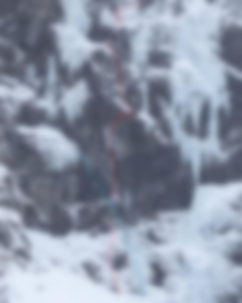 Nach den ersten 20 Metern im leichten Eis benutzt die Linie auf 10 Meter die "Rotzklacheln" (A. Orgler 1998) um auf das große Band unterhalb der riesigen Überhänge zu kommen. Dann schießen die "Victimes des étique(ttes)" mit 4 Schlaghaken 25 Meter gerade durch die von filigranen Zapfen und dünnen Glasuren gespickten Dächer, immer gerade weiter über geniale Graspolster-Kletterei und über vereiste Fichten bis zum höchten Punkt im Eis.